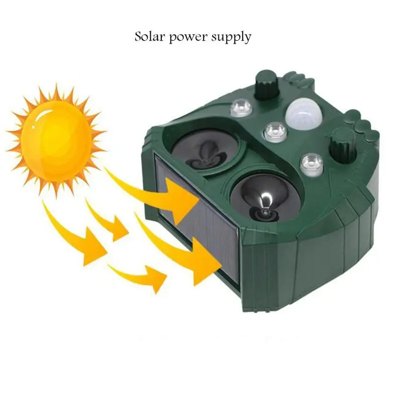 Продукт имеет светодиодный светильник с функцией стробоскопа, чтобы мгновенно беспокоить животных, и различные частоты ультразвуковых звуковых волн 15-65 кГц для различных ультразвуковых водителей животных.