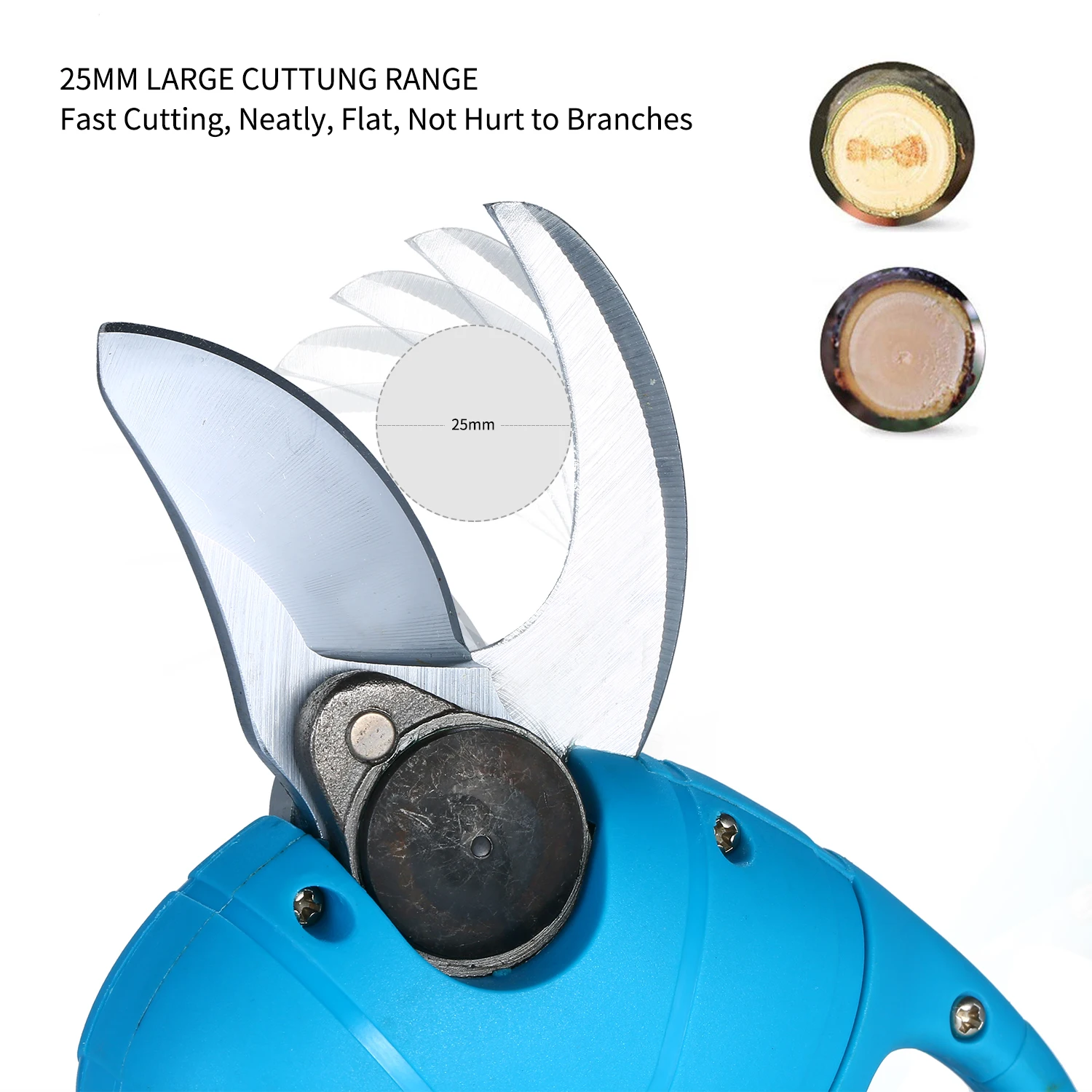 Высокая производительность-используется специальное стальное лезвие SK5 и высококачественный бесщеточный мотор, он чрезвычайно острый и прочный, что позволяет резать ветки с максимальным диаметром 25 мм, повысьте эффективность резки на 300%, чем традиционные ножницы.