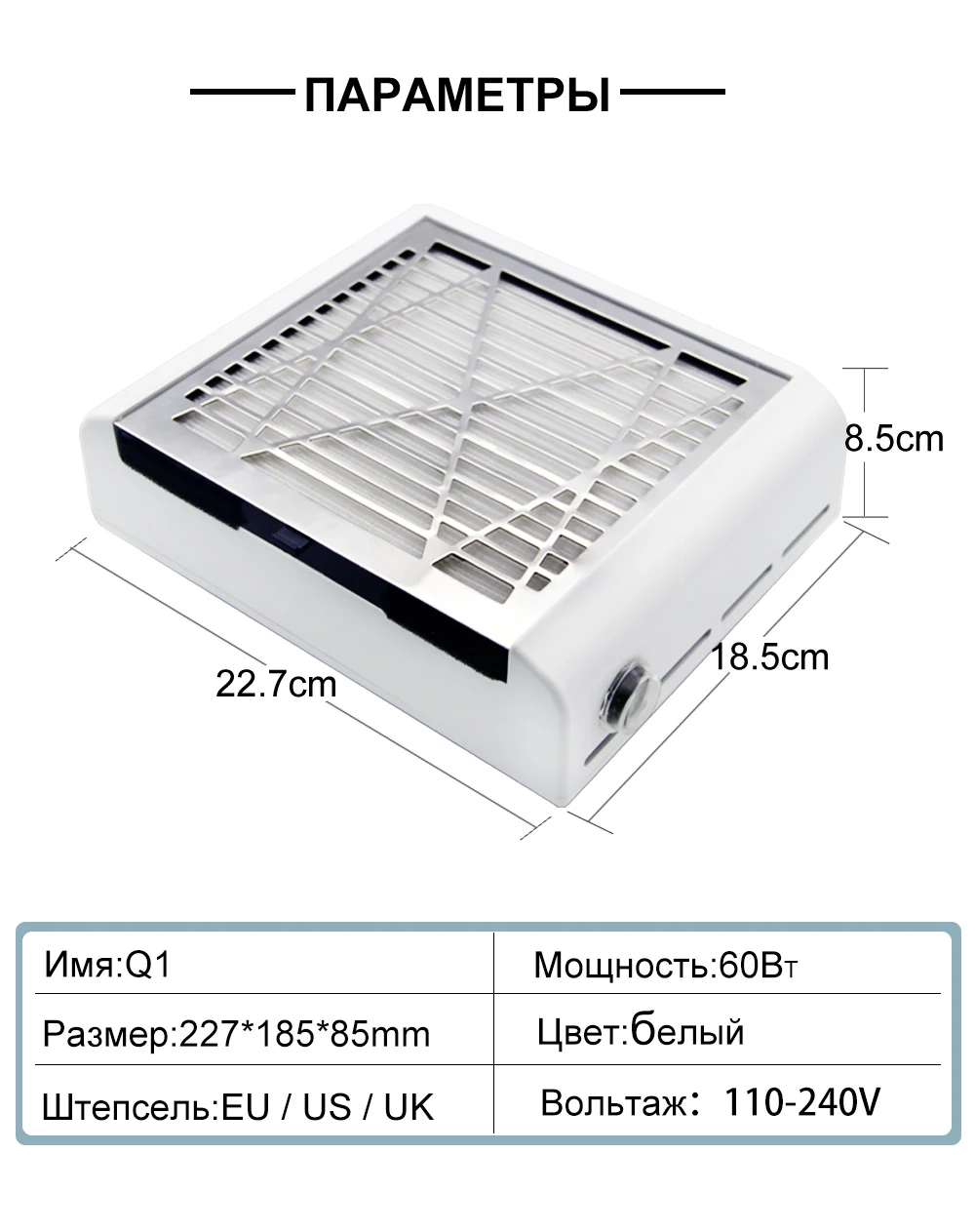 Описание: пылеуловитель может также использоваться для ногтевого искусства, ювелирной резьбы, уплотнения резки, штамповки полировки, ремесленника или другой ситуации. Он может защитить вас от пыли и избежать вдыхания в легких, дает людям большую гарантию для здоровья. Особенности: Многоразовый фильтр. Используйте фен для продувки, но не мойте его. Удобно чистить, разработан со съемным фильтром, который удобно для пользователей, чтобы вынуть его и очистить. Идеальный вакуумный эффект, этот гвоздь всасывающий пылеуловитель может достигать 100% вакуумного эффекта, не проливается пыль, и предлагает вам более чистую среду для дизайна ногтей.