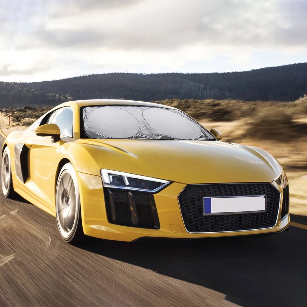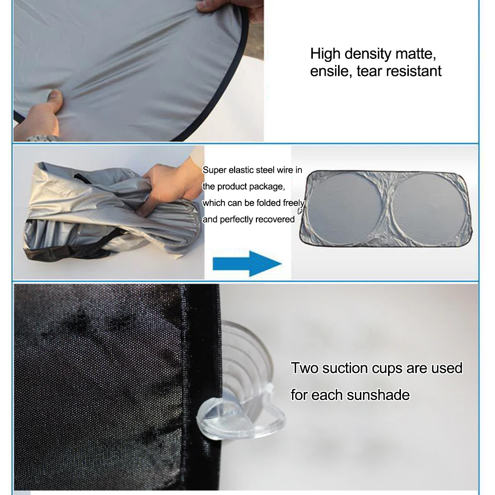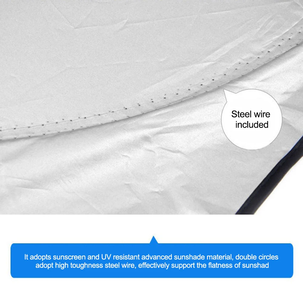 Инновационный солнцезащитный козырек с двойной поддержкой для лобового стекла изготовлен из высокоплотного УФ-отражающего материала, армированного высокопрочной и прочной металлической проволокой и технологией снижения тепла, которая может блокировать 99% вредных ультрафиолетовых лучей и тепла.