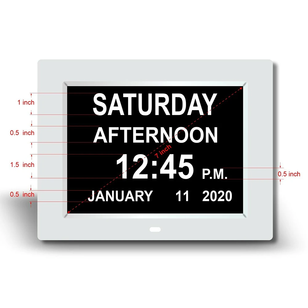 -BEquipped с функцией отображения 8 языков, которая очень удобна для людей разных национальностей и регионов. -Языки-английский, испанский, французский, немецкий, итальянский, польский, голландский, валлийский -Этот продукт имеет автоматический светильник Функция затемнения в ночное время, кроме того, он также имеет автоматический освежитель воздуха с таймером и dual-отображение даты функции. -Четко обозначьте весь день недели, месяца и даты большими, смелыми буквами и без запутанных аббревиатур. -7 дюймов HD ЖК-дисплей цифровые часы с календарем отображает точное время в большом, яркий и четкий дисплей. -Его легко увидеть со стороны комнаты и бесценно для людей с дефектами зрения.