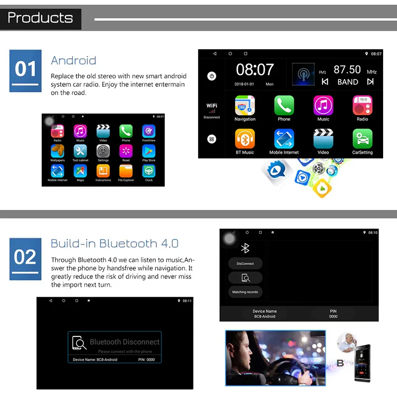4 ядра 1,2 ГГц Процессор + DDR3 1 ГБ флэш-памяти + 16 Гб памяти + емкостный Sn + Wifi + GPS навигация + руль; управление + зеркальная связь + Bluetooth + Встроенный микрофон + FM/AM + RDS + Поддержка функции USB DVR + OBD2 Funtion + Europe DAB; функция + 1080P Vedio Play + HD 1024*600 + Система контроля давления в шинах