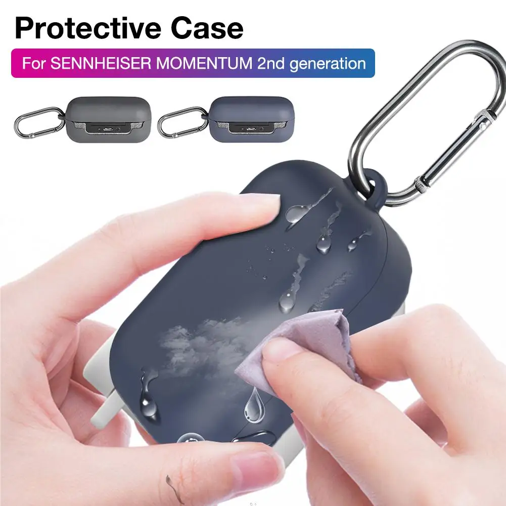 1、Practical in Use: With the case, all functions and buttons can be easily used without any interference.2、East to Carry: The case is light and thin to touch, impact-resistant and scratch-resistant design, and it features the precise hole position for easy access to the charging port.3、Protective Materials: The shell of the case is made of flexible, impact-resistant silicone material to protect your device for SENNHEISER MOMENTUM from scratches and external shocks.4、Multiple Colors: There are multiple colors for optional, thus providing you with different choices.5、Practical Case: The silicone protective case is designed for SENNHEISER MOMENTUM true wireless 2nd generation Bluetooth headset and the case will not affect the charging function.Specifications:Name: Protective Case for SENNHEISER MOMENTUM 2nd generation Material: natural eco-friendly siliconeColor: black/BlueProduct weight: about 37gProduct size: about 87*37**47mm/3.43*1.46*1.85inPacking size: 92*42*50cm/36.22*16.54*19.69inApplicable models: for SENNHEISER MOMENTUM 2nd generation Bluetooth headsetUse: carry with you, anti-lost, simple and elegantTip:Dust on the product can be wiped directly with a rag, or rinse it with water;Packing List:1*Protective Case1*CarabinerNotes:1. This product is only an accessory and the package does not include the headset for SENNHEISER MOMENTUM 2nd generation. 2. The product size is measured manually, and the tolerance of 0-1cm belongs to the normal range.