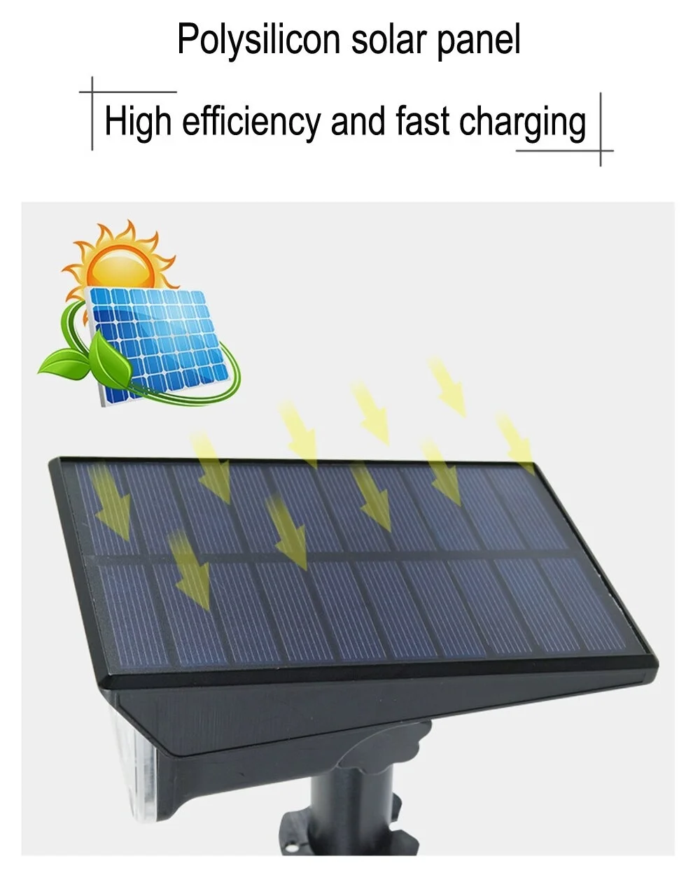 Цвет: 6000K холодный белый Солнечная панель: поликристаллическая солнечная панель 5 В/2 Вт Батарея: 3,7 V / 1800mAh 18650 # литиевая батарея Яркость: 150-200 лм Время работы: около 6-9 часов Продолжительность зарядки: более 8 ч Функция: светильник управляется, солнечная панель заряжает батарею в течение дня, а светильник автоматически заряжается ночью. Водонепроницаемость: IP65 Материал: АБС-пластик + Поликарбонат Цвет корпуса: черный Посылка в комплекте 1 x Солнечные прожекторы 1 x Руководство пользователя 1 шип 3 x расширяющиеся резиновые вилки 3 винта Советы: Пожалуйста, подтвердите, что переключатель находится в состоянии «ON», так что солнечная панель может быть заряжена нормально, и светильник может автоматически включаться ночью. Первый клик: яркий режим 100% яркости Второй щелчок: 50% яркости в режиме низкого светильник Третий клик: закрыть Если у вас есть какие-либо вопросы с продуктами, не стесняйтесь связаться с нами!