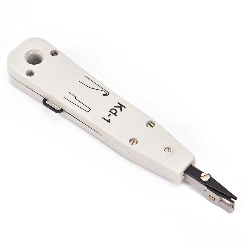 Используется для легкой установки проводов в телефонную розетку, планшайбу Cat5e или патч-панель. Включает в себя концы инструмента для резки, зачистки и вставки. Используется для UTP и FTP кабелей.