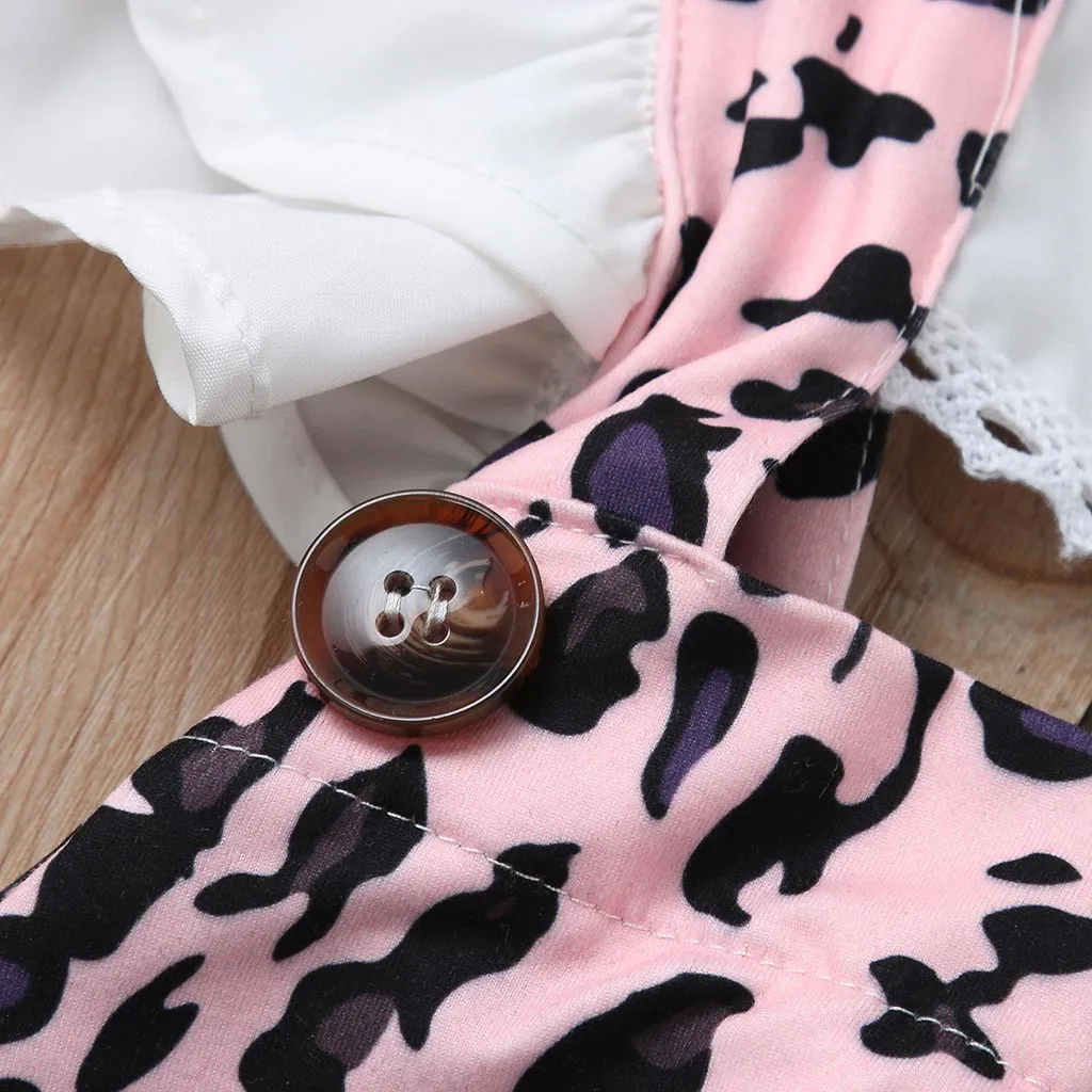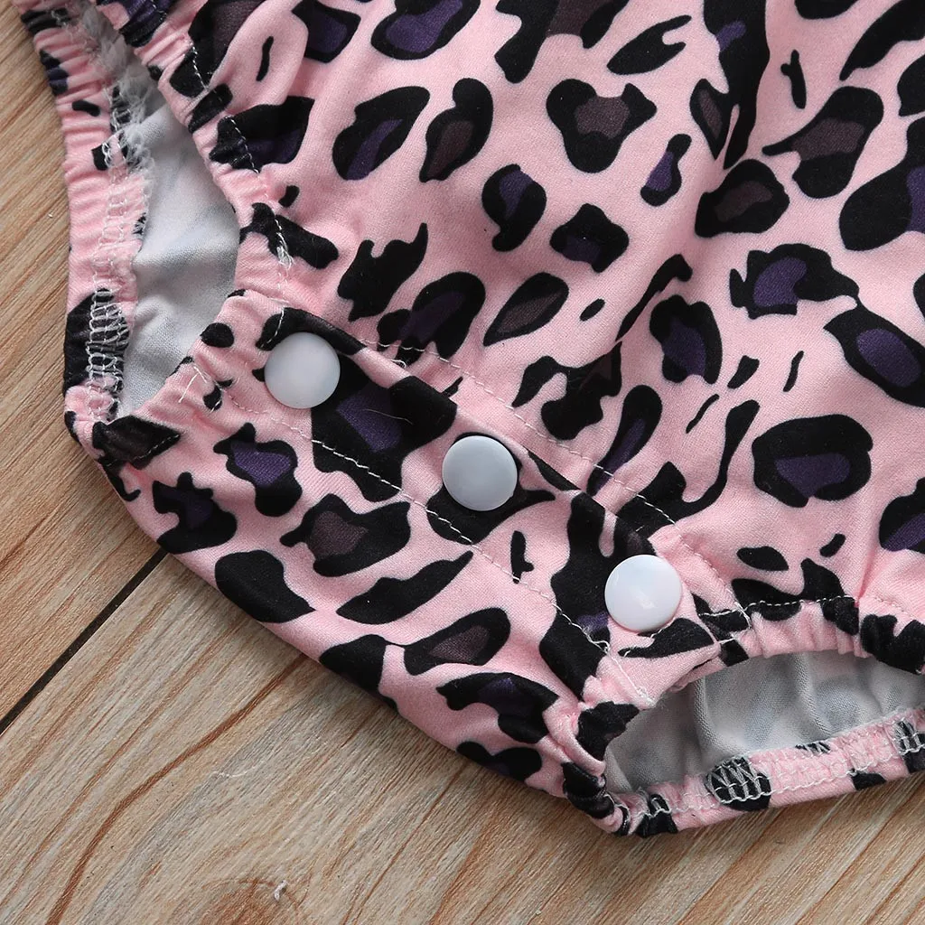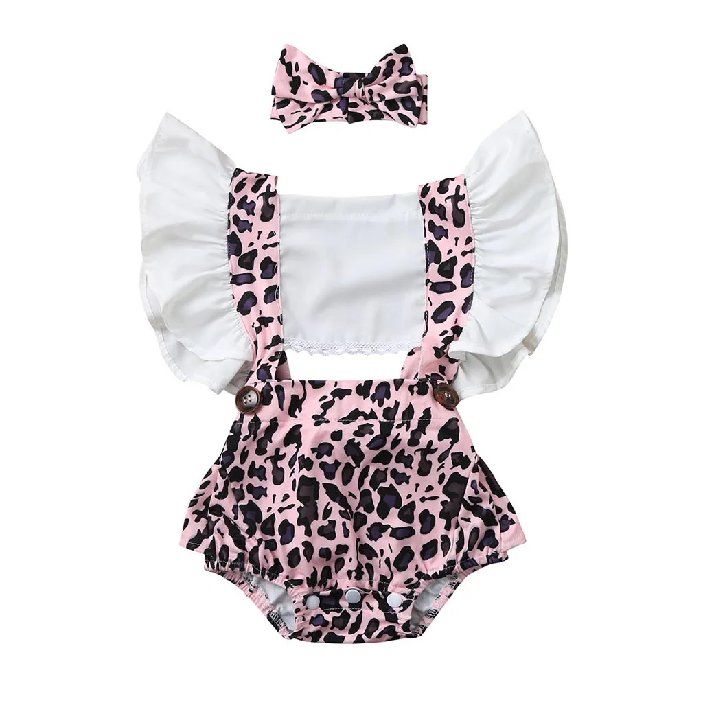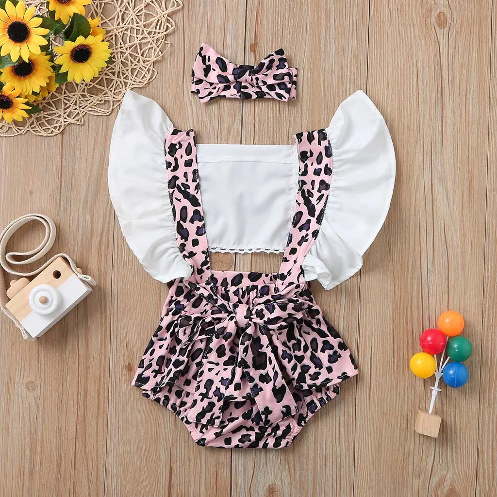 (6-24M) девочка хакама мешок fart Лето летающий рукав жабо Леопардовый печати Ремень хакама комбинезон + повязка для волос для детей 50 *