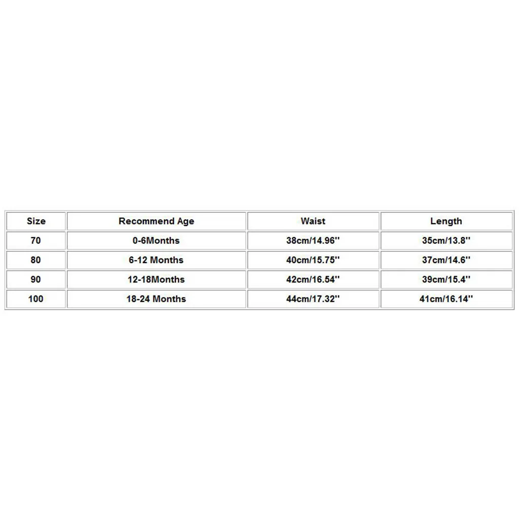 Рекомендованный возраст; Ширина Обхват талии Длина 70 От 0 до 6 месяцев 38 см/14,96'' 35 см/13,8'' 80 6-12 месяцев 40 см/15,75'' 37 см/14,6'' 90 12-18Months 42 см/16,54'' 39 см/15,4'' 100 18-24 месяцев 44 см/17,32'' 41 см/16,14''