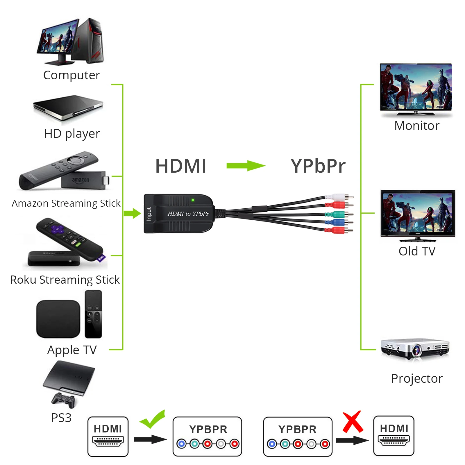 2. Этот элемент не имеет функции даунскейлера. Если ваше компонентное видеоустройство не поддерживает 720 или 1080, вам необходимо настроить входной сигнал HDMI на разрешение 480 или 576. Поскольку некоторые компонентные видеоустройства могут быть старыми, поддерживаются только форматы разрешения 480 или 576. И этот продукт является байпадом, что означает, что выходной сигнал зависит от входного сигнала.