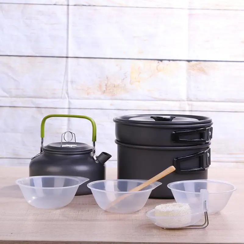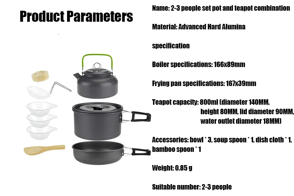 Характеристики: Материал: алюминий, пластик Подходит для: 2 - 3 человек Размер горшка: 166x89мм Размер сковороды: 167x39мм Емкость чайника: 800 мл Общий вес: 850 г Посылка: 1 * горшок 1 * крышка кастрюли 1 * сковорода 1 * чайник 1 * Крышка чайника для чая 3 * миски 1 * ложка для супа 1 * Губка люфа 1 * бамбуковая ложка