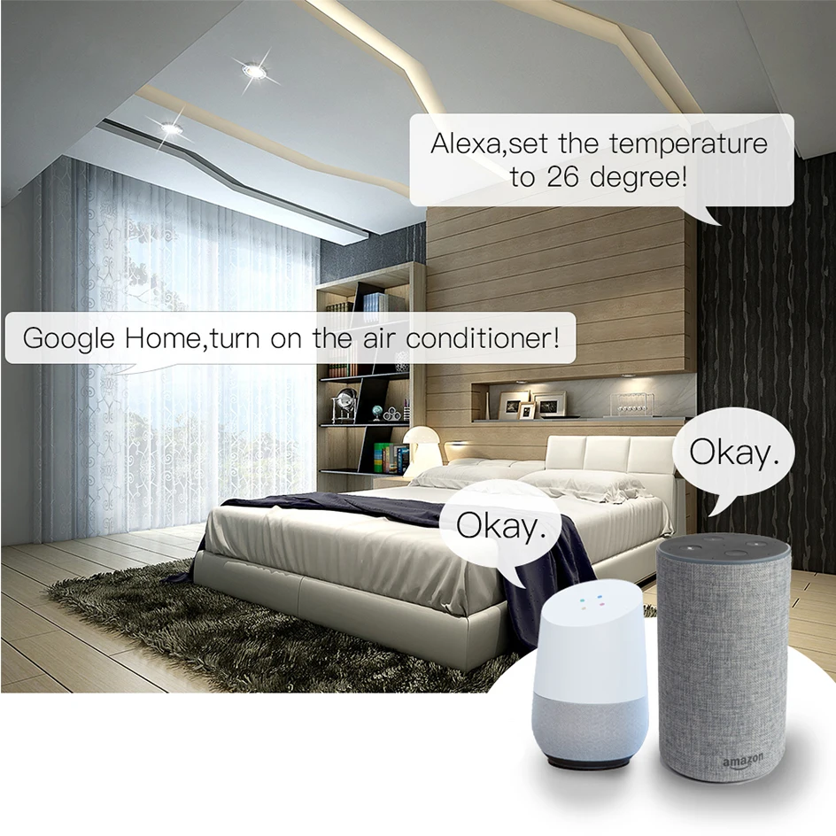 2.Голосовое управление без рук:Совместим с Amazon AlexaЭхоИ Google Home для легкого голосового управления, Обеспечивая вашу умную жизнь с гораздо большим удобством. Свободно контролироватьВаши кондиционерыЧерез голос, когда ваши руки не свободныИ отрегулируйте температуру по голосовой команде.