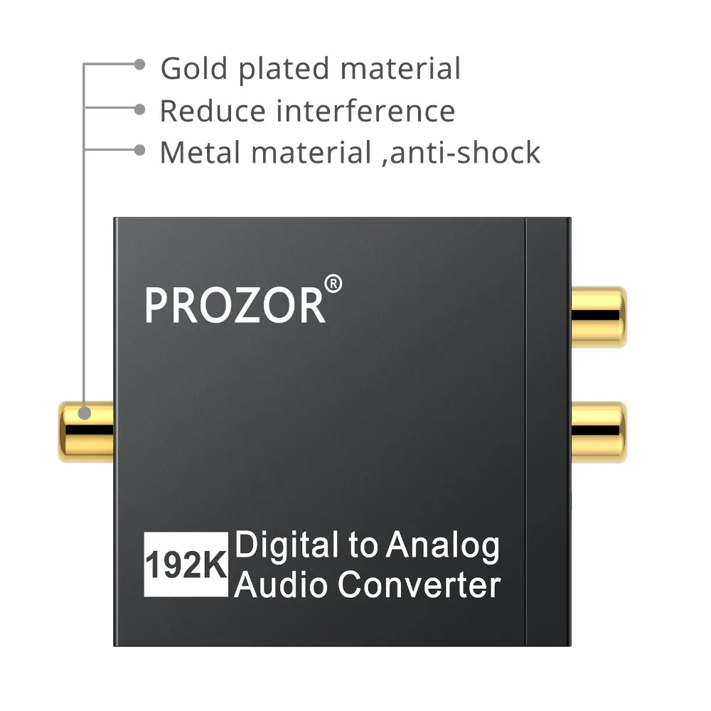DAC PROZOR 192 кГц предназначен для профессиональной обработки аудиосигнала. Он может легко конвертировать коаксиальный или Toslink интерфейс в аналоговый аудио интерфейс RCA и 3,5 мм разъем для наушников.