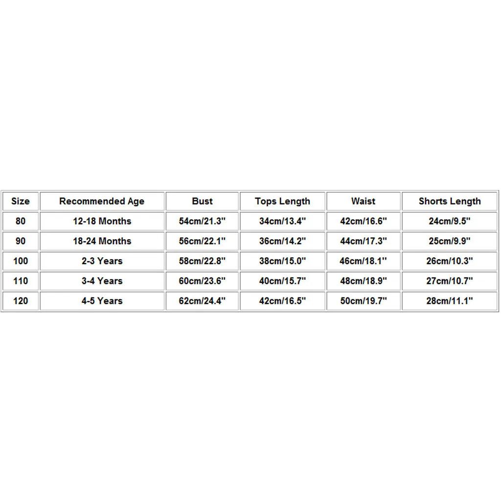 Размер Рекомендуемый возраст Бюст Длина топа Талия Длина шорт 80 12-18 месяцев 54 см/21,3" 34 см/13,4 дюйма 42 см/16,6" 24 см/9,5" 90 18-24 месяцев 56 см/22,1" 36 см/14,2" 4 см/17,3" 25 см/9,9" 100 От 2 до 3 лет 58 см/22,8" 38 см/15,0" 46 см/18,1'' 26 см/10,3" 110 От 3 до 4 лет 60 см/23,6" 40 см/15,7" 48 см/18,9" 27 см/10,7" 120 От 4 до 5 лет 62 см/24,4" 42 см/16,5" 50 см/19,7" 28 см/11,1"