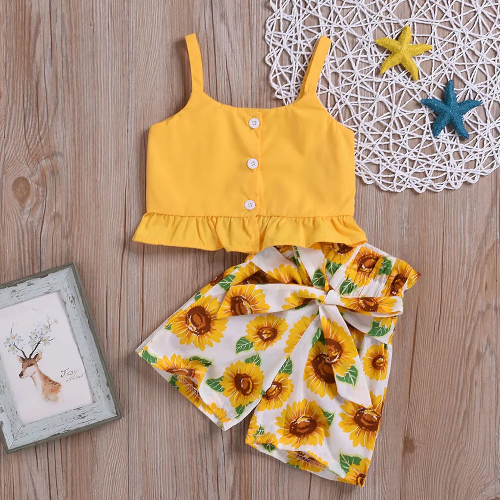 Однотонный жилет без рукавов с оборками для маленьких девочек топы + шорты в подсолнухами