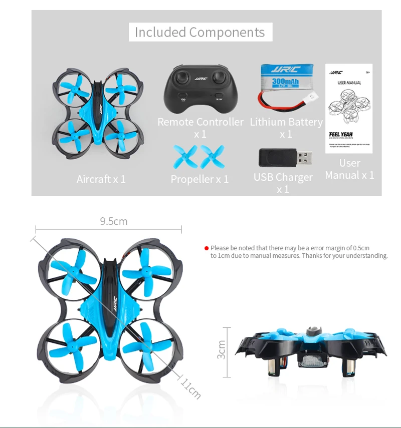 Color: Blue/Green (Optional) Frequency: 2.4G Channel: 4CH Quadcopter Battery: 3.7V 300mAh (Included) Remote Controller battery: 3*1.5VAAA battery (Not Included) Flight Time: 5-6 minutes Charging Time: 60-80 minutes Remote Control Distance: 50-60 m Drone Size w/ Protective Frame (cm): 11*9.5*3 Propeller Size (cm): 3.1*2.3*8 Remote Control Size (cm): 11.2*7.5*5Package List: