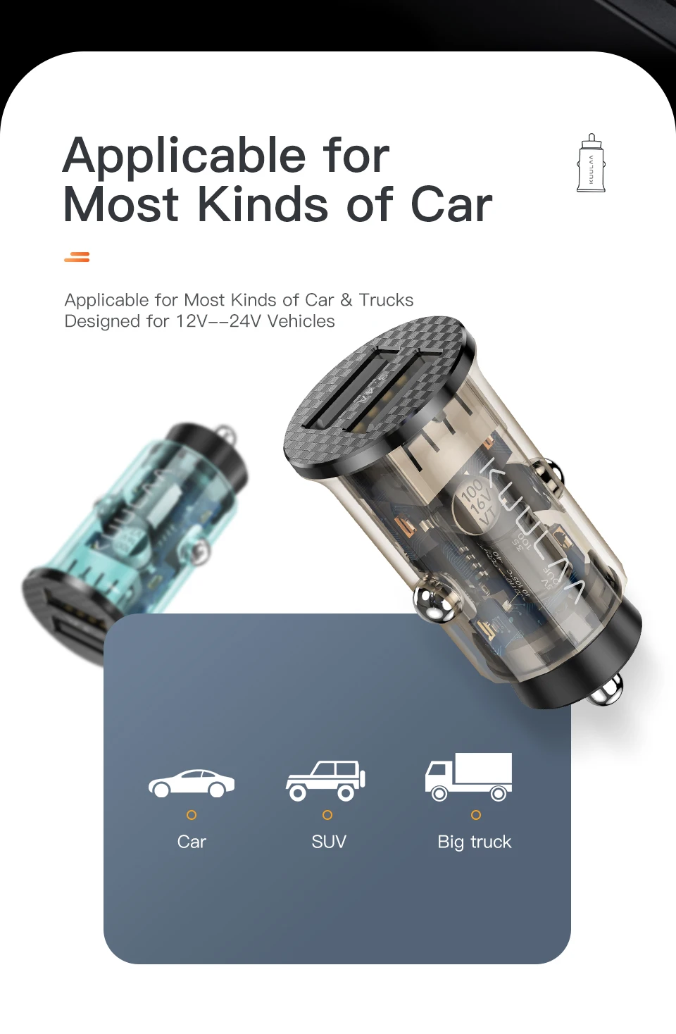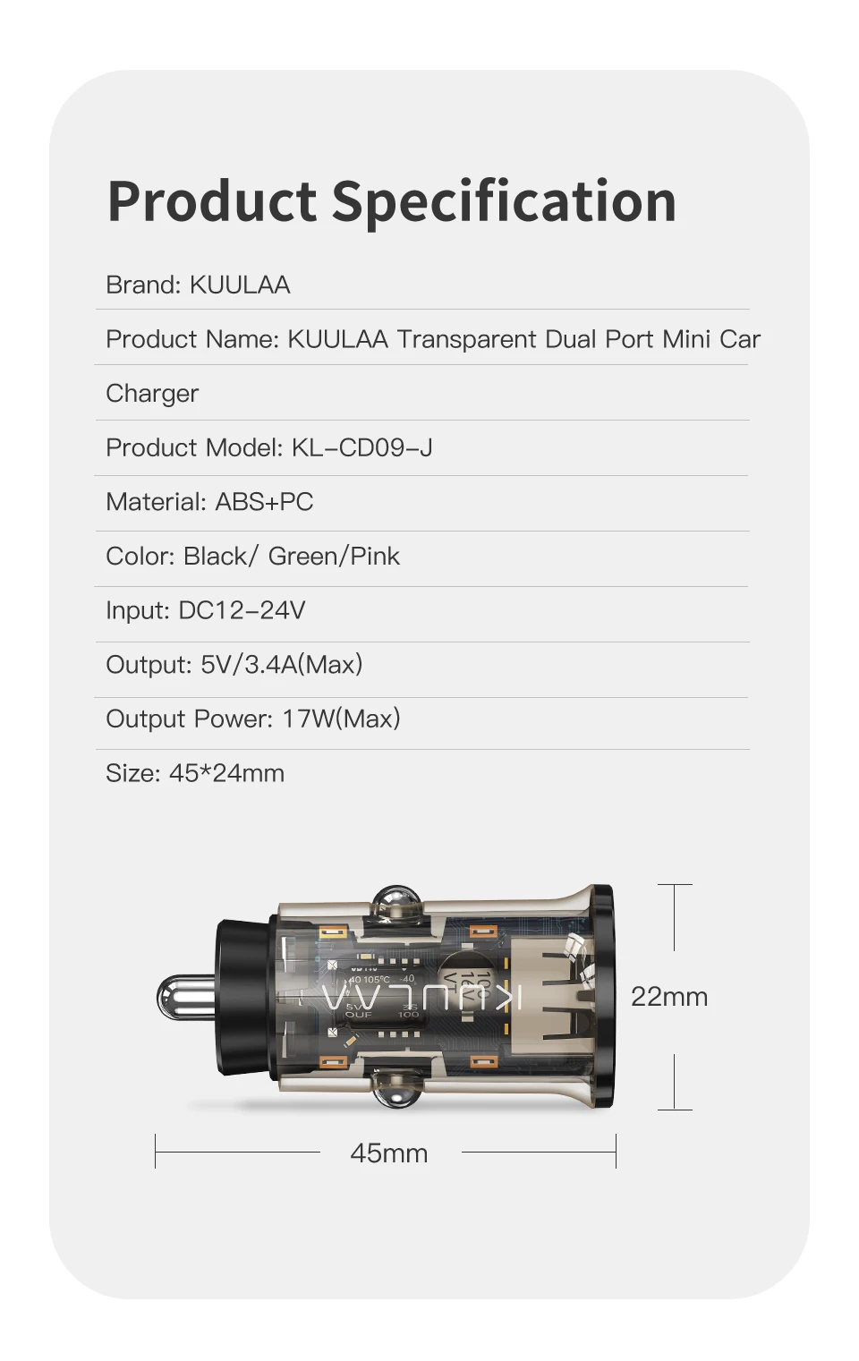 Бренд: KUULAA Название продукта: KUULAA прозрачный двойной порт мини автомобильное зарядное устройство Модель изделия: KL-CD09-J Материал: АБС-пластик + Поликарбонат Цвет: черный/зеленый/розовый Вход: DC12-24V Выход: 5 В/3,4 А (макс.) Выходная мощность: 17 Вт (макс.) Размер: 45*24 мм