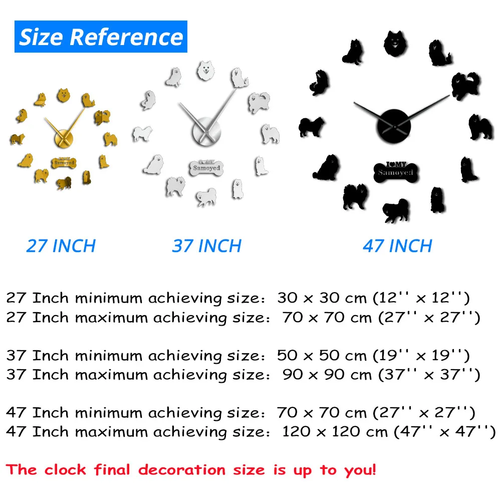 Размер часов зависит от вашего предпочтения для украшения стены. Длина часовой стрелки -27 дюймов: 13,5 см (5,3 дюйма) -37 дюймов: 23,5 см (9,25 дюйма) -47 дюймов: 31,5 см (12,5 дюйма) Длина минутной стрелки -27 дюймов: 19,5 см (7,6 дюйма) -37 дюймов: 31,5 см (12,4 дюйма) -47 дюймов: 39 см (15,4 дюйма) Минимальное достижение составляет -27 дюймов: 30x30 см (12 ''x 12'') -37 дюймов: 50x50 см (19x19 дюймов) -47 дюймов: 70x70 см (27x27 дюймов) Максимальное достижение -27 дюймов: 70x70 см (27x27 дюймов) -37 дюймов: 90x90 см (37x37 дюймов) -47 дюймов: 120x120 см (47x47 дюймов)
