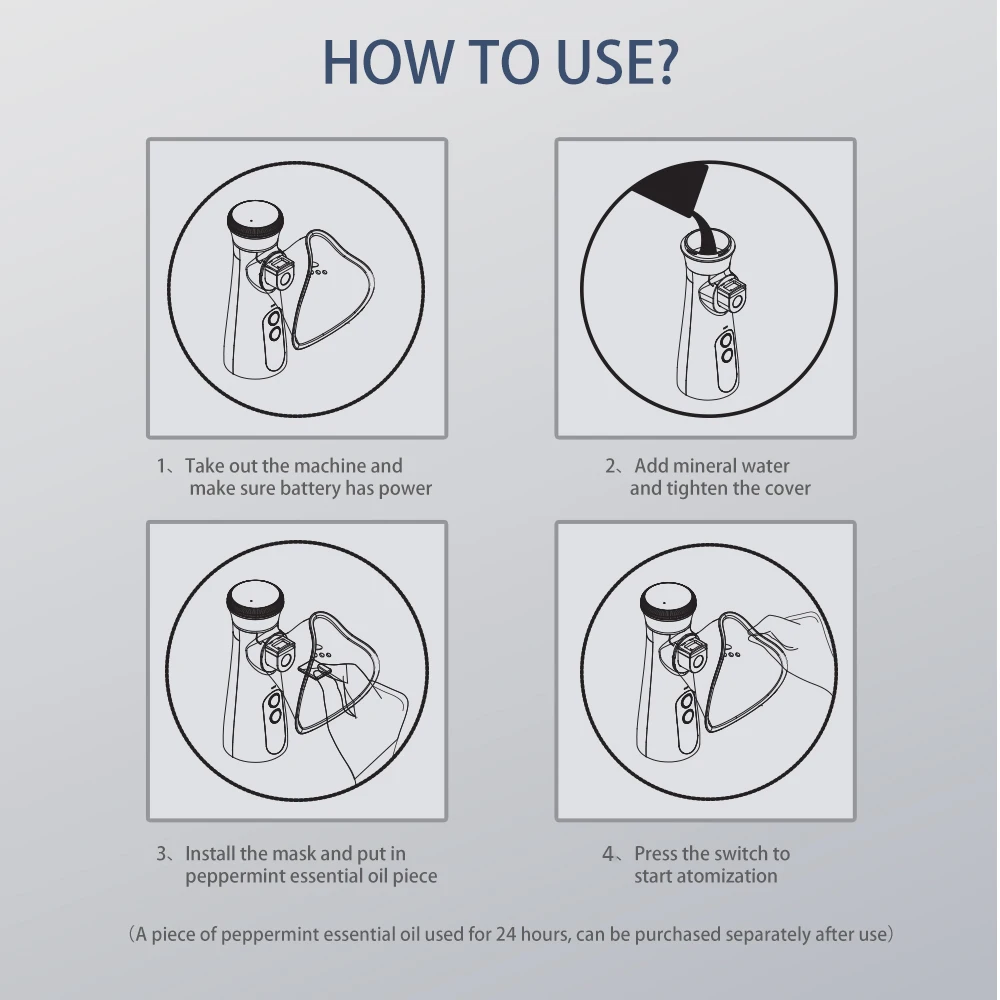 Посылка включает в себя 20 шт. заменяемых накладок для эфирного масла перечной мяты. Один предмет эфирного масла перечной мяты Время использования: в течение 24 часов 20 штук можно использовать 20*24 = 480 ч.