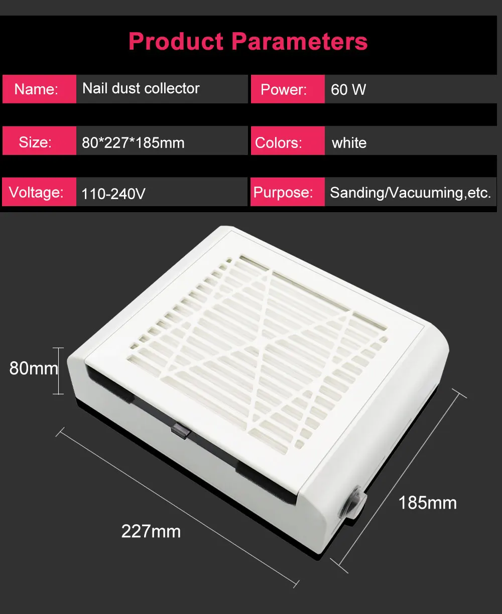 Описание: пылесборник может также использоваться для работы с ногтями, резьбы ювелирных изделий, резки Уплотнения, полировки, ремесленника или других ситуаций. Он может защитить вас от пыли и в дальнейшем избежать вдыхания в легких, предложить людям большую гарантию на здоровье. Особенности: Многоразовый фильтр. Используйте фен для выдувания, но не мойте его. Удобно чистить, разработан со съемным фильтром, который удобен для пользователей, чтобы вынуть его и очистить. Идеальный вакуумный эффект, этот пылеуловитель для всасывания ногтей может достигать 100% вакуумного эффекта, не проливая пыль, и предлагает вам экологически чистую среду для дизайна ногтей.
