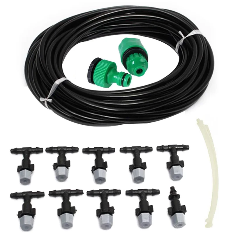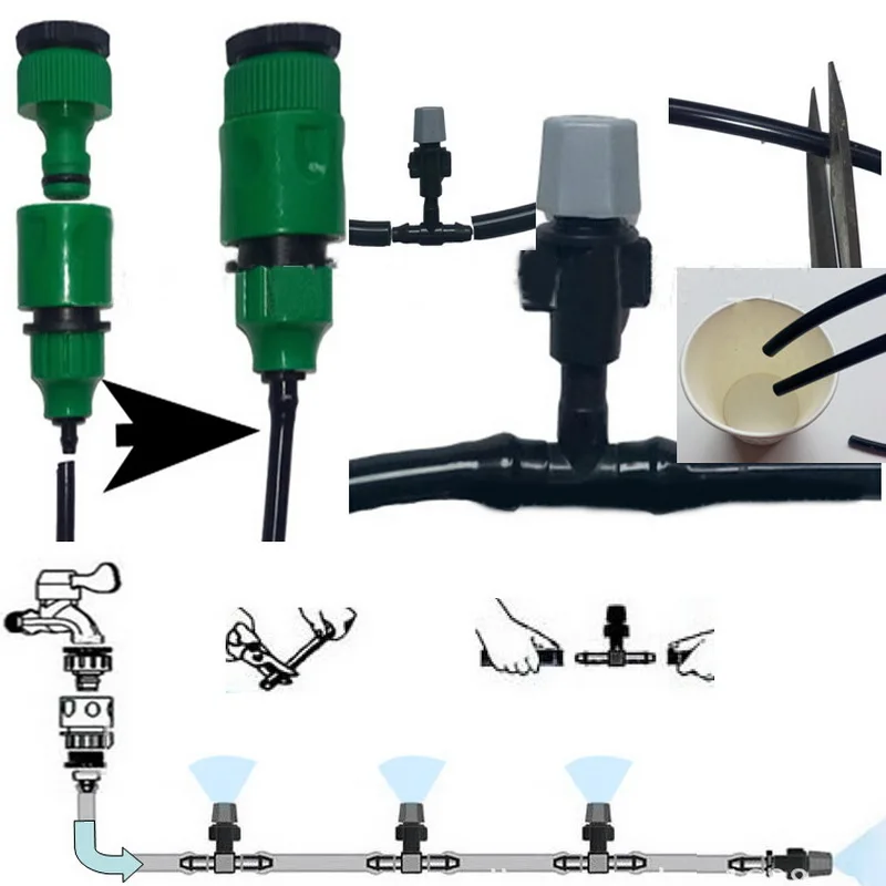 1. Микро комплект капельного полива: включает адаптер соединителя смесителя, быстрый соединитель соединения, шланг трубопровода, сопло запотевания, 3 тройника, одиночный конечный соединитель и нейлоновый кабель.