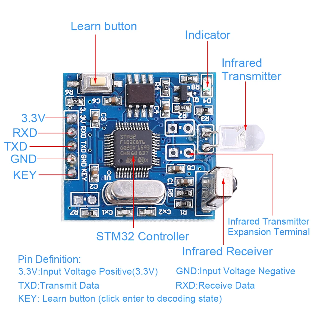 Параметры: 1>. Модель: YS-IR05F 2>. Рабочее напряжение: 3,3 В постоянного тока 3>. Рабочий ток: <100 мА 4>. Ток в режиме ожидания: 30 мА 5>. Ток излучения: 57 мА 6>. Ток изучения состояния: 66 мА 7>. Метод связи: UART, уровень TTL 3,3 В 8>. Скорость передачи: 9600 бит/с 9>. Дальность приема: 6-10 метров (зависит от угла окружающего светильник) 10>. Расстояние излучения: 6-10 метров (под влиянием приемного оборудования под углом окружающего светильник) 11>. Угол трансивера: 45 градусов 12>. Поддержка инфракрасного несущего диапазона частот: 16-80 кГц 13>. Рабочая температура:-20 ℃ ~ 85 ℃ 14>. Рабочая влажность: 5% ~ 95% относительной влажности 15>. Размер печатной платы: 28*27*22 мм Функция: 1>. Этот модуль имеет функцию декодирования и кодирования инфракрасного пульта дистанционного управления, совместим с распространенными бытовыми приборами, такими как: кондиционер, приставка, ТВ-приставка, спутниковая машина, электрический вентилятор, mp3-плеер, аудиооборудование, проектор, CD, DVD-плеер и т. д. Устройство дистанционного управления 2>. Как только ключ войдет в состояние обучения, сигнал пульта дистанционного управления может быть декодирован. 3>. Полученный инфракрасный сигнал внутренне преобразуется в специальный код и выводится через последовательный порт, а длина данных составляет 236 байт. 4>. Может расширить 4 инфракрасных излучателя для достижения полного контроля. 5>. Декодирование дальнего обучения, дистанционное управление, расстояние до 10 метров. 6>. Операция проста, и полученное декодирование изначально отправляется обратно в модуль для восстановления соответствующего инфракрасного сигнала. 7>. В сочетании с компьютером или одночиповым управлением последовательным портом можно сбросить все пульты дистанционного управления для интеллектуального управления. Применение: 1>. Однокристальный + модуль IR05F ---> для создания приборов умного домашнего контроля 2>. Модуль последовательного порта Wi-Fi + модуль IR05F ---> для удаленного управления инфракрасными приборами 3>.USB к последовательному порту + модуль IR05F ---> для достижения инфракрасного оборудования с компьютерным управлением 4>. Модуль последовательного порта Bluetooth + модуль IR05F ---> для достижения мобильный телефон, инфракрасное устройство управления IPad