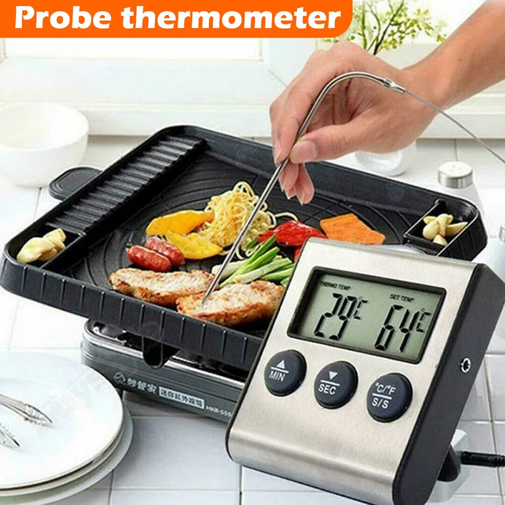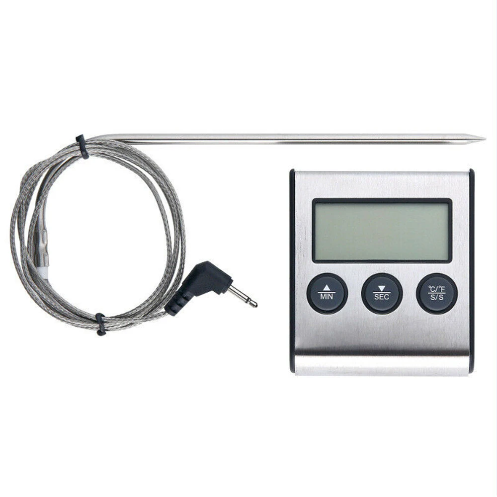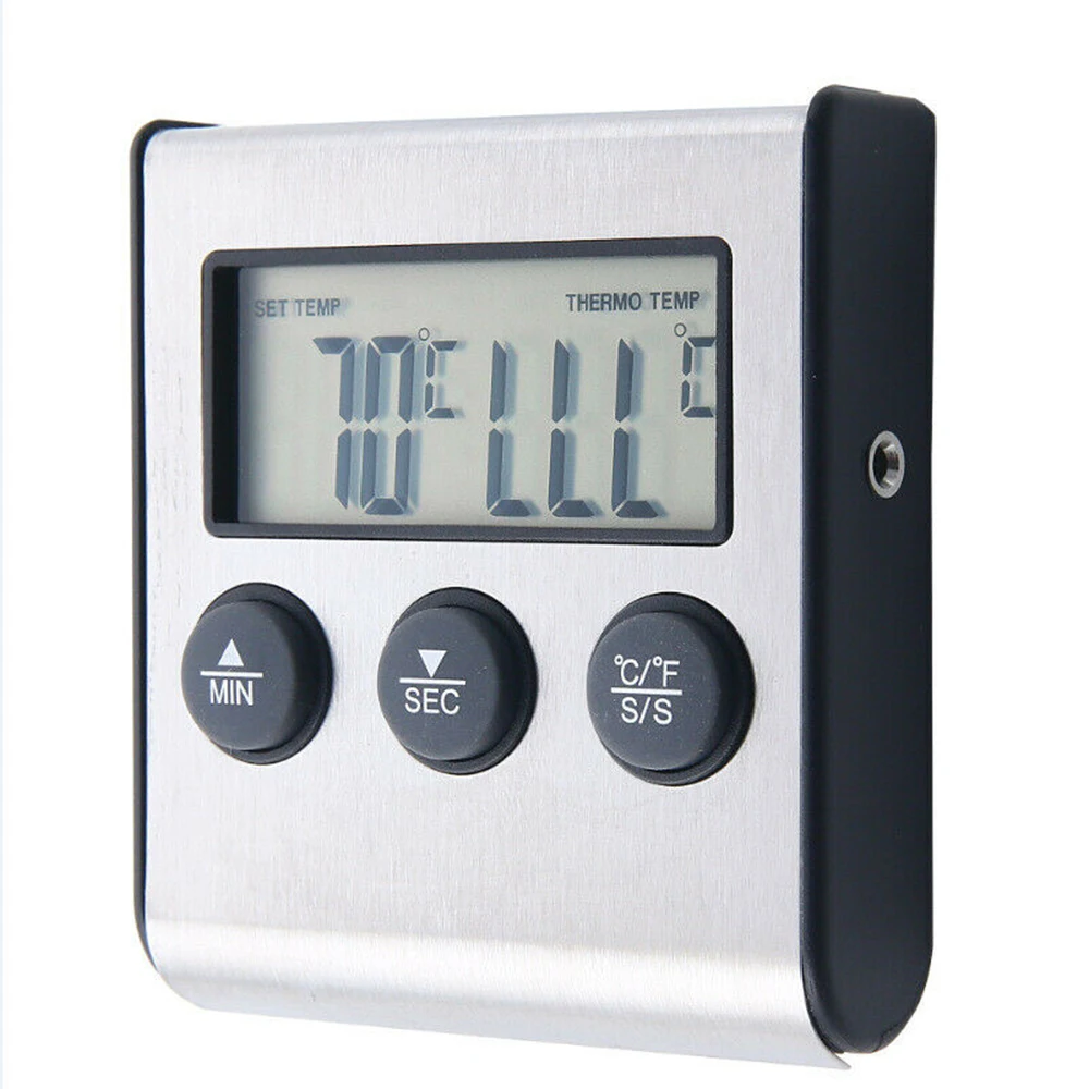 Выключатель питания, переключатель ℃/switch Будильник часы/таймер Функция обратного отсчета, максимальное время 99 часов 59 минут. Преобразование единиц-как по Фаренгейту, так и по Цельсию. Датчик пищевой нержавеющей стали для точного и быстрого получения температуры. Мягкий сетчатый кабель из нержавеющей стали. Зонд и провод выдерживают до 572 °F (300 °C). Подвесное отверстие, магнитная подложка и столешница, легко хранить. Функция высокотемпературной сигнализации (звуковой сигнал продлится 60 секунд, вы можете нажать любую кнопку, чтобы остановить его)