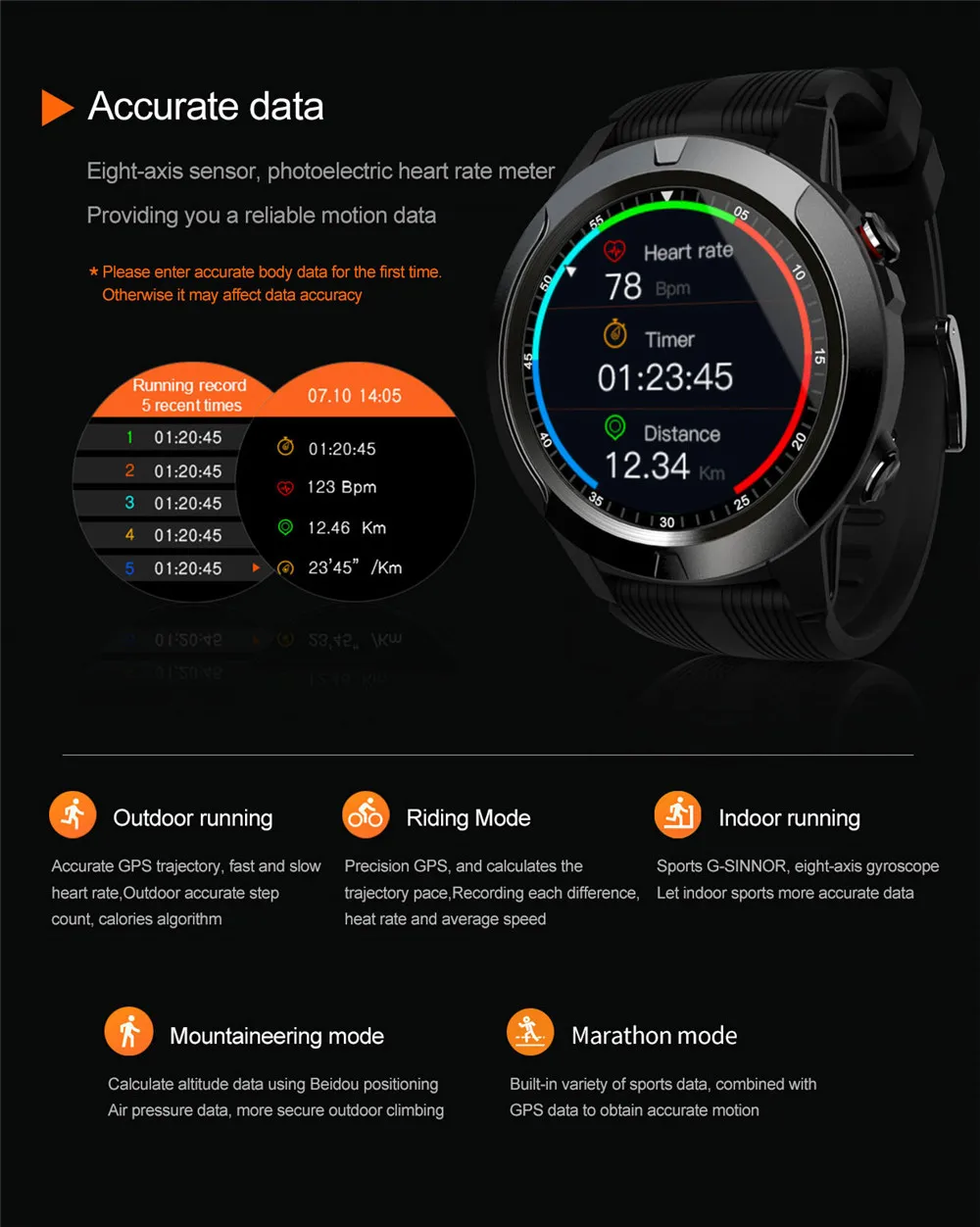 1. Полный Круглый экран конденсатора 2. Встроенный GPS, компас, давление воздуха 3. Точный мониторинг сердечного ритма, мониторинг артериального давления, поддержка нескольких спортивных режимов 4. Уникальная микро-sim-карта (версия GSM) 5. Подсчет шагов, мониторинг сна, погода в реальном времени 6. Версия карты поддерживает голосовые вызовы Bluetooth 7. Водонепроницаемость IP67