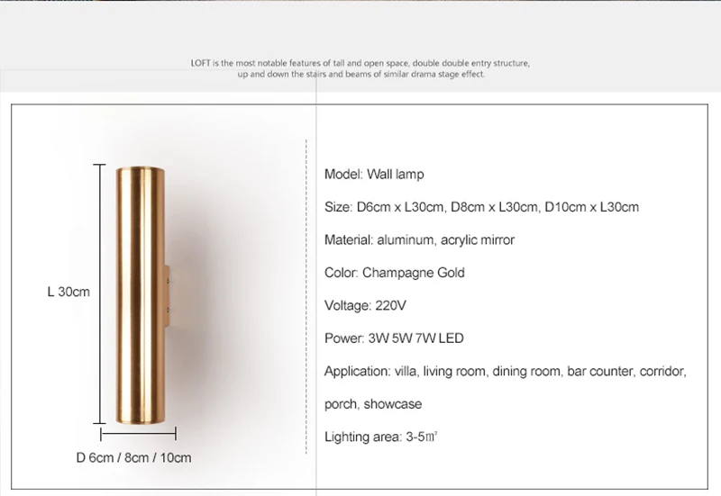 1. Материал: алюминий 2. Цвет корпуса: золото шампанского 3. Входное напряжение: ac220в 4. Светильник источник света: теплый белый свет/холодный белый-светодиодный 5. Цветовая температура: (теплый белый) 2700-3200K,(холодный белый) 5500-6500K 6. Срок службы от источника энергии:> 50000 часов 7. Размер: D6 * l30см, D8 * l30см, D10 * l30см 8. Мощность: 3 Вт, 5 Вт, 7 Вт, 9. Применение: вилла, гостиная, столовая, барная стойка, коридор, веранда, витрина 10. Площадь освещения; 3-5 м