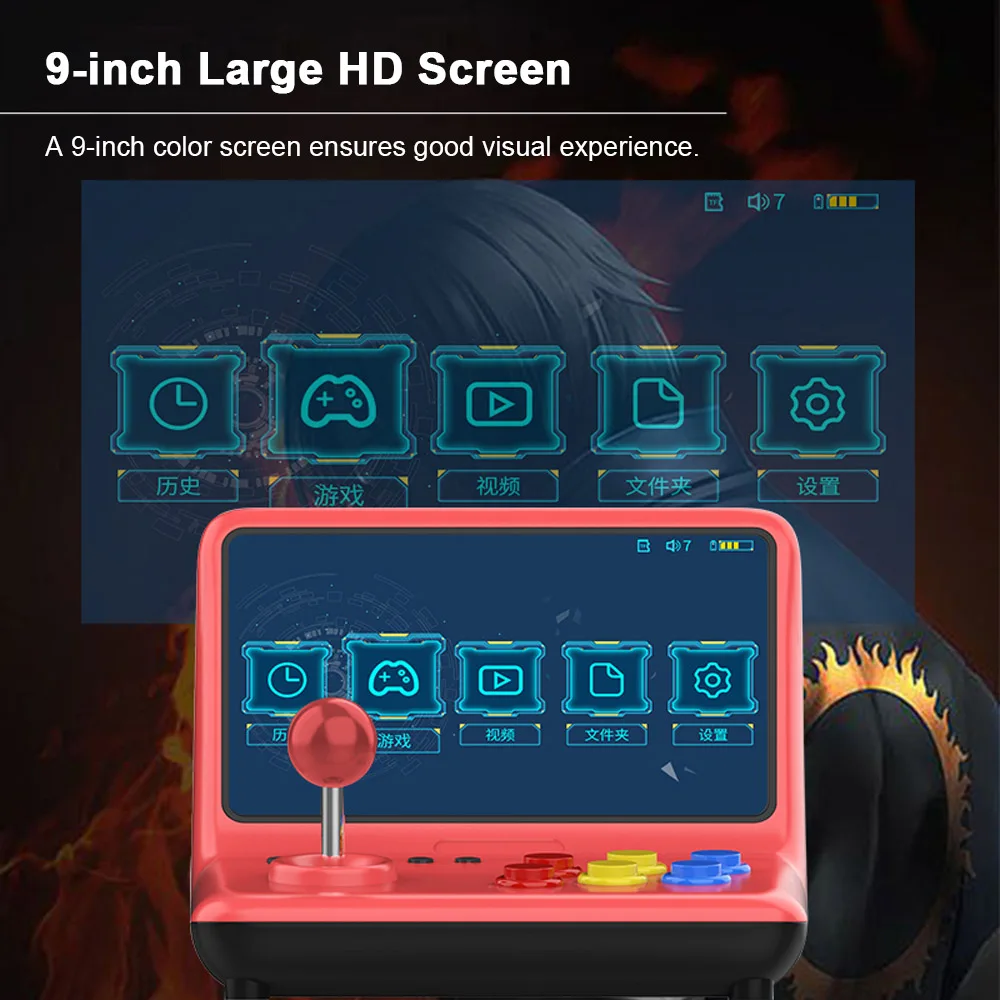 9-дюймовый цветной экран обеспечивает хороший визуальный опыт. Он также поддерживает hd-выход, вы можете наслаждаться играми с большим экраном на внешнем дисплее.