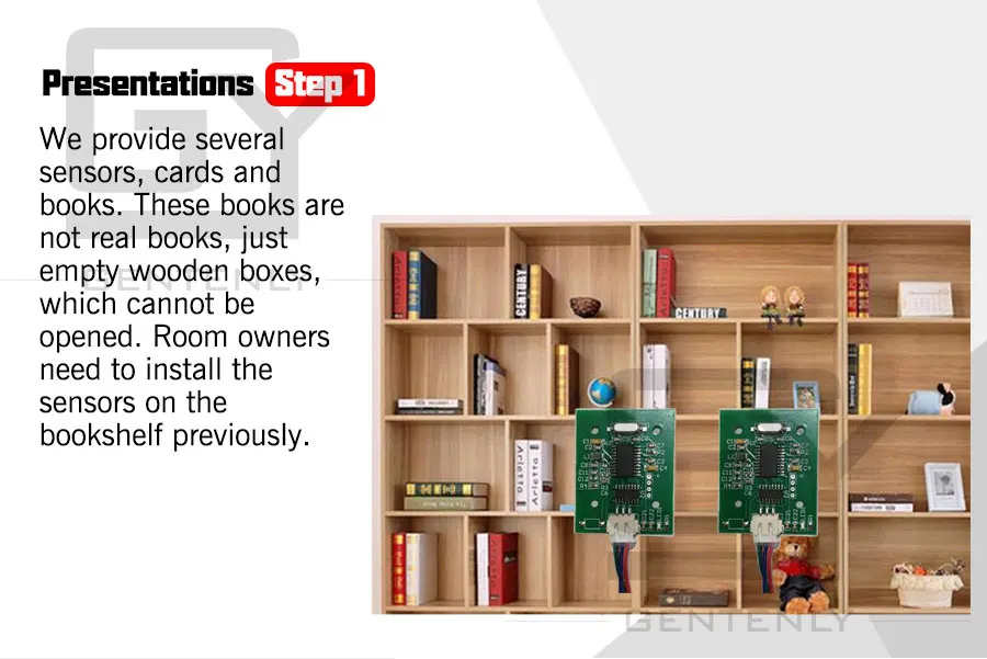 Презентация Шаг 1 Мы предоставляем несколько датчиков, карт и книг. Эти книги не настоящие книги, просто пустые деревянные ящики, которые не могут быть открыты. Владельцам комнат необходимо предварительно установить датчики на книжную полку.