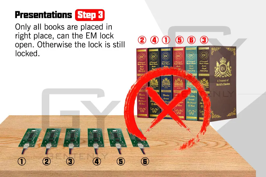 Шаг 3 Только все книги находятся в правильном месте, может EM lock открыть. В противном случае замок все еще заблокирован.