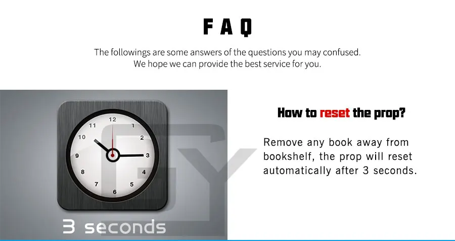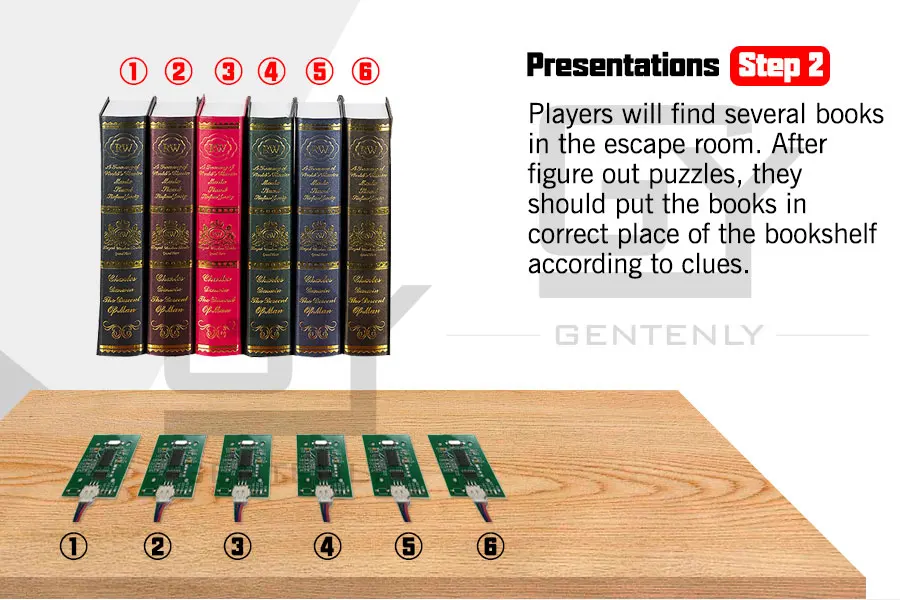 Как играть Владелец комнаты должен установить датчики на книжной полке ранее. В комнате побега вы найдете несколько книг. После решения некоторых пазлов, они должны поместить книги в правильное место книжной полки, чтобы открыть дверь. Неправильное размещение не может разблокировать.