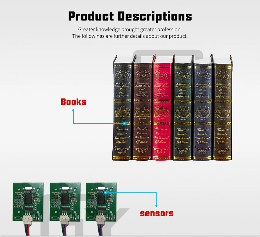 Изюминка продукта 1. Пользователи могут выбрать количество книг. Эти книги не настоящие, просто пустая деревянная коробка, которую нельзя открыть. 2. Пользователи могут устанавливать th датчики в книжной полке или столе. 3. Пользователи могут изменить аудиофайлы аудиоверсии.