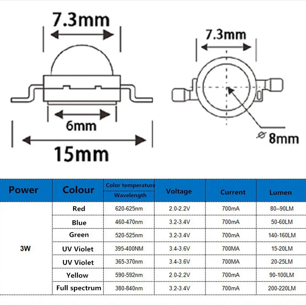 Напряжение продукта: Красный светильник, желтый светильник (2,0-2,2 В), синий светильник, зеленый светильник, полный спектр (3,2-3,4 в), УФ-светильник (3,4-3,6 В)
