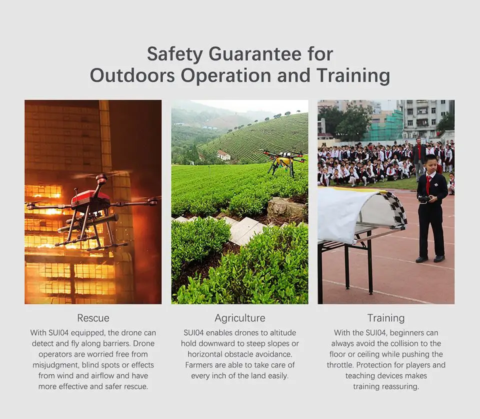 [Ультразвуковой Модуль]: SUI04-это Гибридный ультразвуковой датчик передачи и приема, он поможет дронам достичь автономного избегания препятствий в 8 направлениях по горизонтали, избегайте препятствий на верхней стороне и удерживайте высоту вниз.
