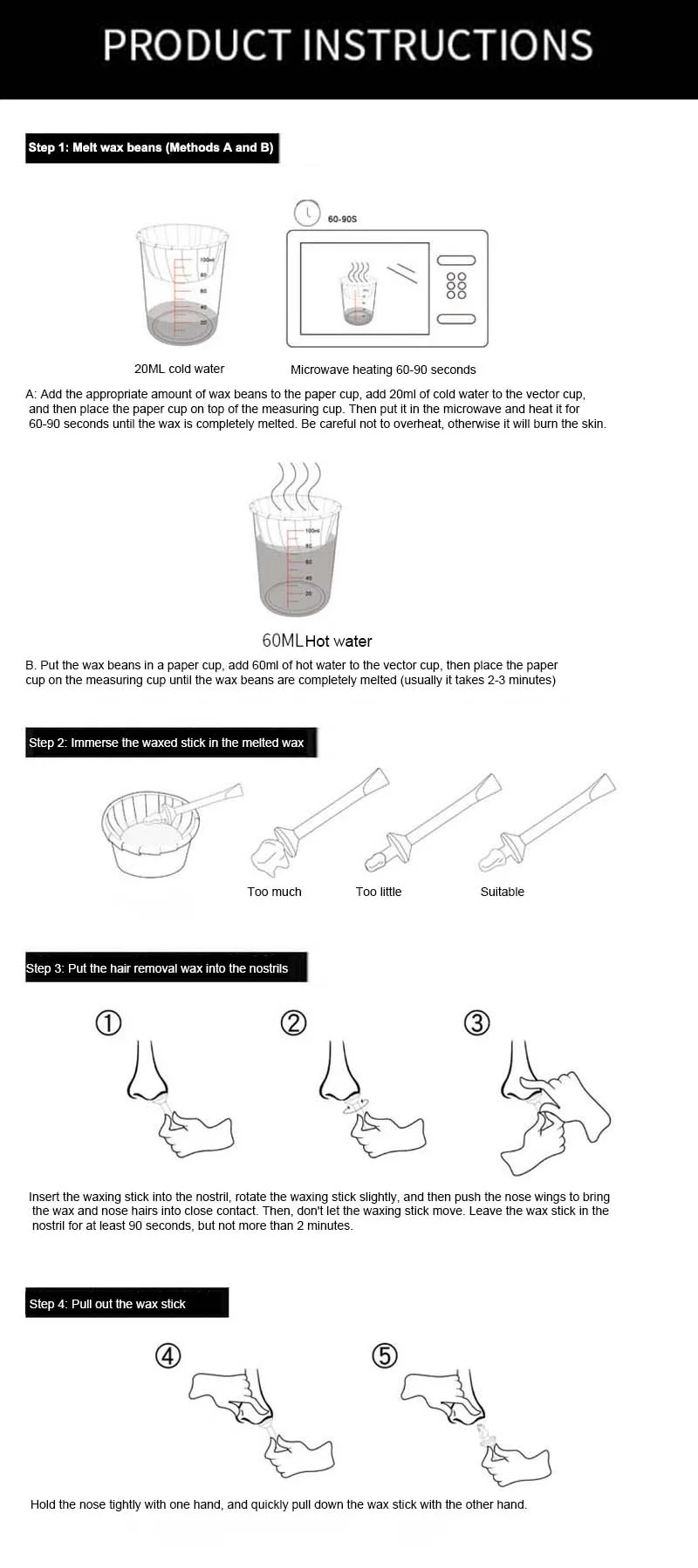 -- Шаг 1: плавкие восковые бобы (методы A и B) Положите восковые бобы в бумажный стаканчик, добавьте 60 мл горячей воды в векторную чашку, затем поместите бумажный стаканчик на мерный стаканчик, пока восковые бобы не будут полностью расплавлены (обычно это занимает 2-3 минуты) -- Шаг 2: погрузите вощеную палку в расплавленный воск -- Шаг 3: Поместите воск для удаления волос в ноздри Вставьте вощеную палочку в ноздри, слегка поверните вощеную палочку, а затем нажмите на крылья носа, чтобы привести Вощеные и носовые волоски в близкий контакт. Тогда, не позволяйте воском двигаться. Оставьте воск в ноздрю не менее 90 секунд, но не более 2 минут. -- Шаг 4: Вытяните восковую палку Крепко удерживайте нос одной рукой и быстро Потяните вощеную палку другой рукой.