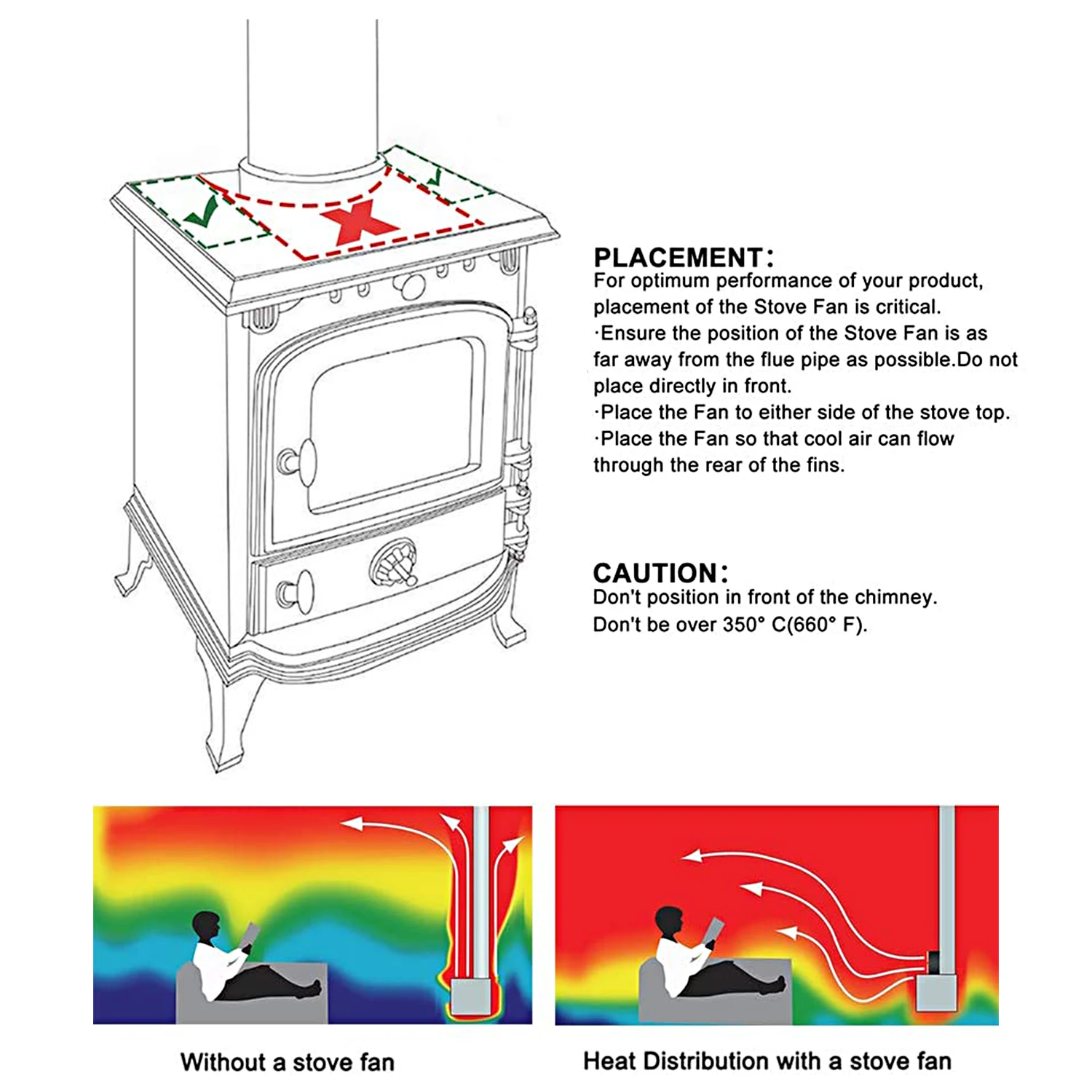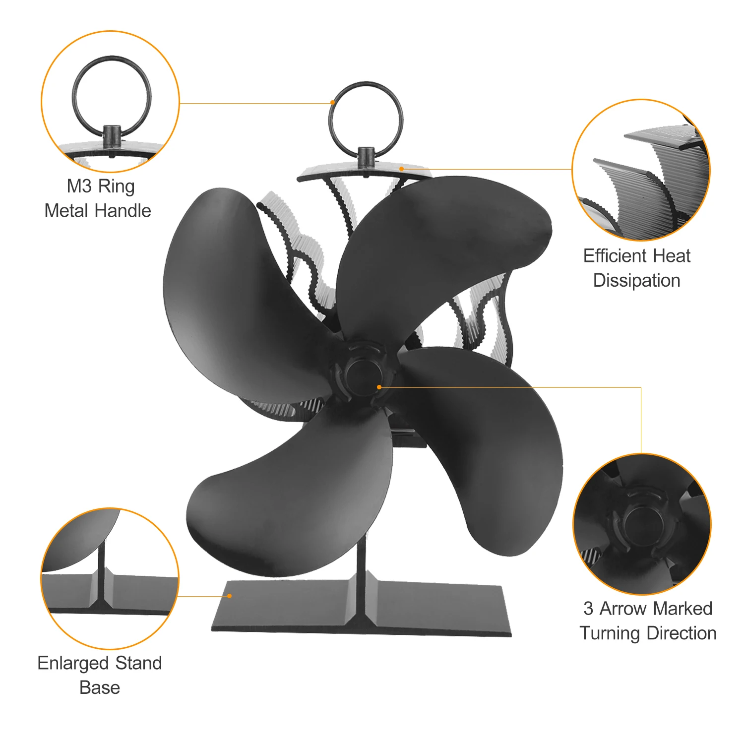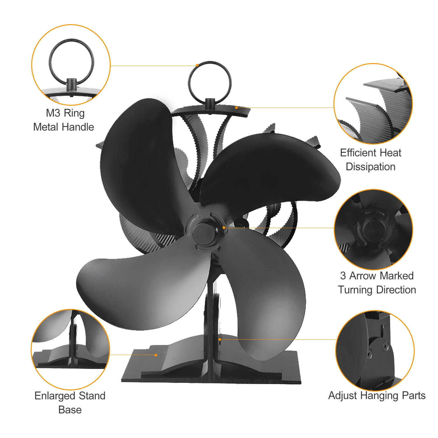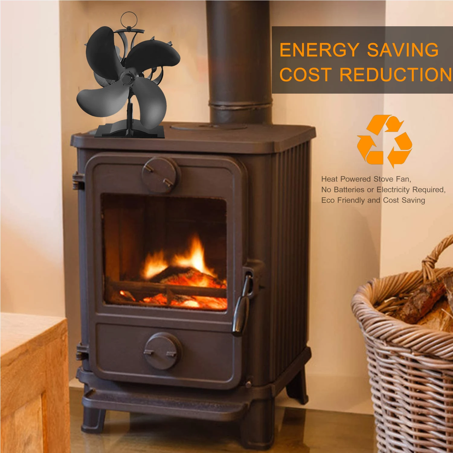 Мощный 4-Лопастной вентилятор печи--- 4 шт. большой диапазон скорости лопастей от 1200 об/мин до 1350 об/мин, поток ветра до 170cfm, которые увеличивают на 80% больше циркуляции теплого воздуха. Более эффективно и дешевле.