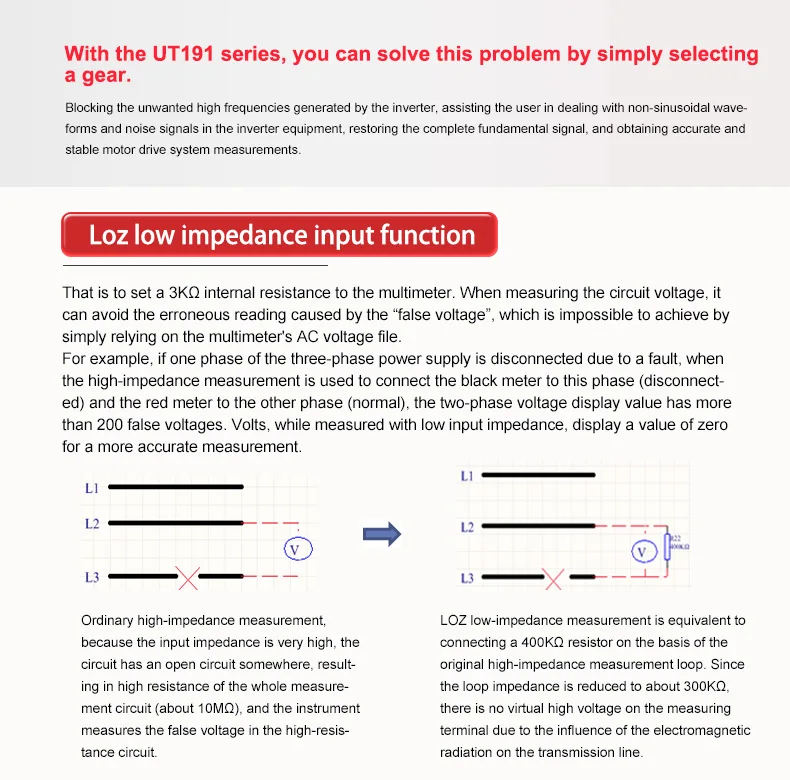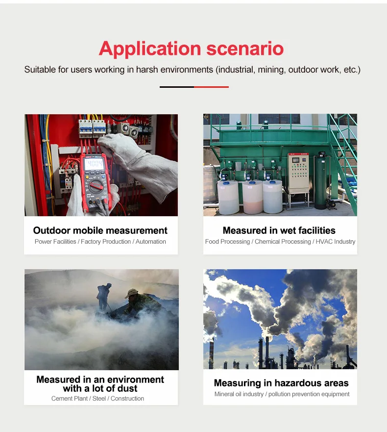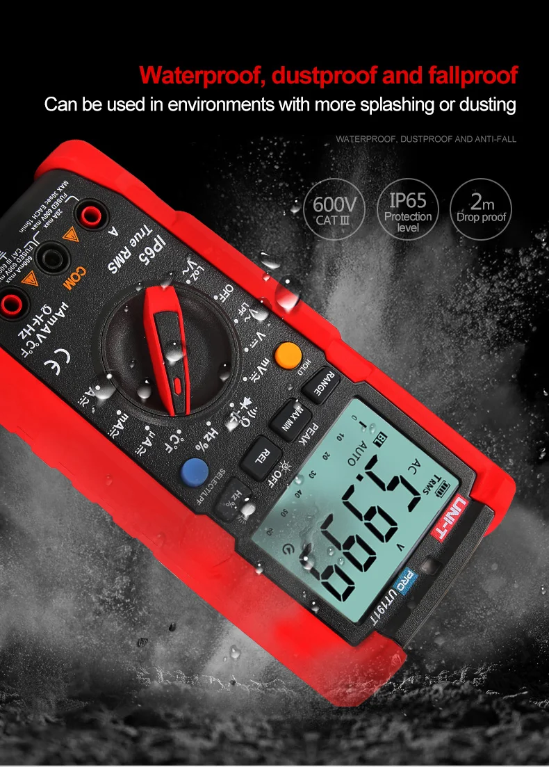 1. Параметры измерения сохранены после сброса питания 2. IP65, 2 м защита от падения 3. Измерение истинного значения/пикового значения 4. Автоматическая подсветка 5. Измерение тока 20A 6. LoZ AC измерение