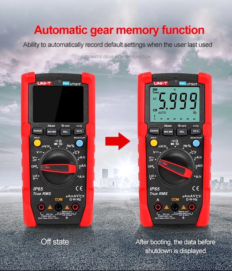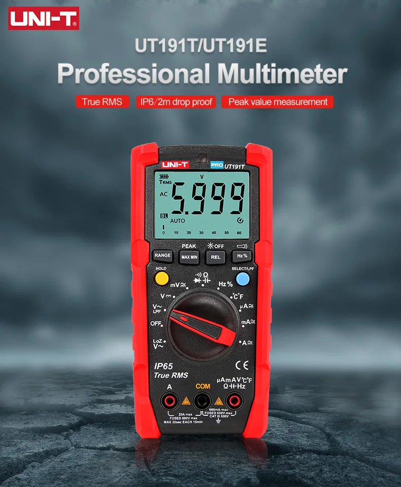 UT191 серия профессиональных мультиметров предназначена для промышленных пользователей. UT191's new function Memory сохраняет последние настройки режима в следующий раз, когда он включен, улучшая эффективность для пользователей. UT191T поддерживает точные и точные измерения температуры. Подходит для использования во влажной и пыльной среде.