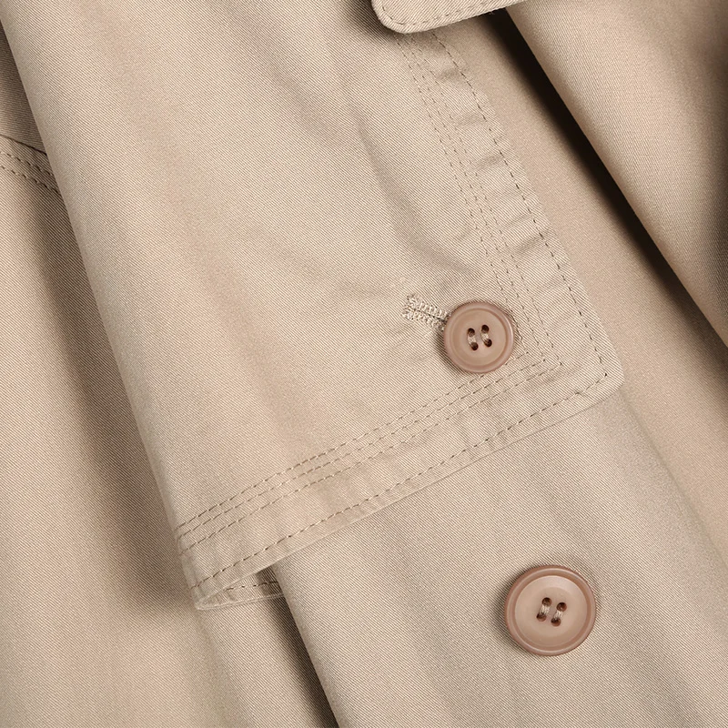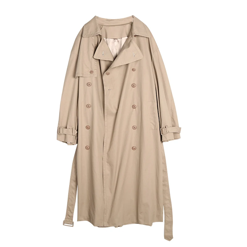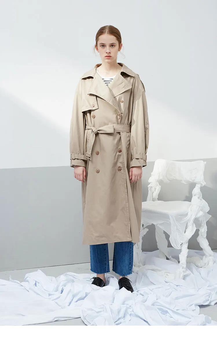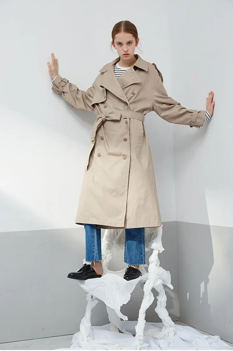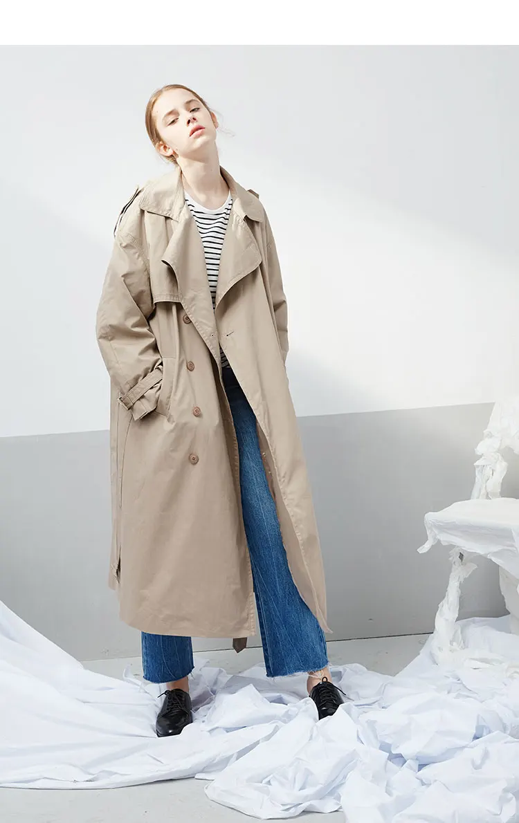 Женский Классический Тренч цвета хаки, повседневный свободный Тренч из 100% хлопка с поясом, двубортное длинное пальто, верхняя одежда, весна-осень 2019 Ткань: 100% хлопок Цвет: хаки Воротник: отложной воротник Тип рукава: длинный рукав