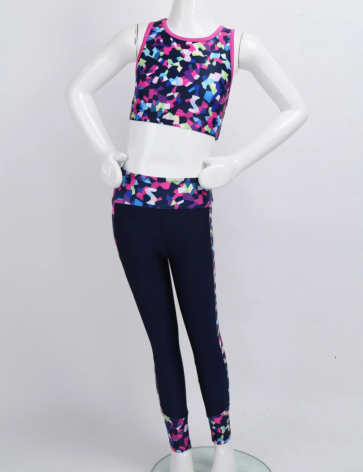 Детский балетный танцевальный костюм для гимнастики для девочек от 6 до 16 лет, наряд сетчатый топ без рукавов с цифровым принтом, майка-борцовка, укороченный топ с леггинсами
