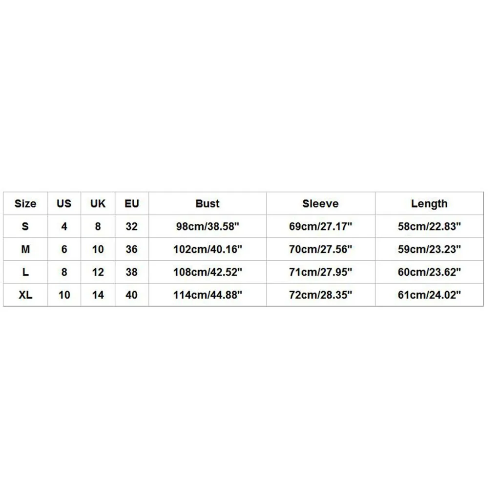 Размер: S US :4 UK:8 EU:32 Бюст: 98 см/38,58 ''рукав: 69 см/27,17'' Длина: 58 см/22,83'' Размер: M US :6 UK:10 EU:36 Бюст: 102 см/40,16 ''рукав: 70 см/27,56'' Длина: 59 см/23,23'' Размер: L US :8 UK:12 EU:38 Бюст: 108 см/42,52 ''рукав: 71 см/27,95'' Длина: 60 см/23,62'' Размер: XL US :10 UK:14 EU:40 Бюст: 114 см/44,88 ''рукав: 72 см/28,35'' Длина: 61 см/24,02''