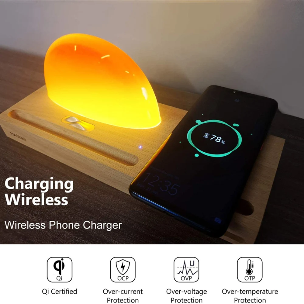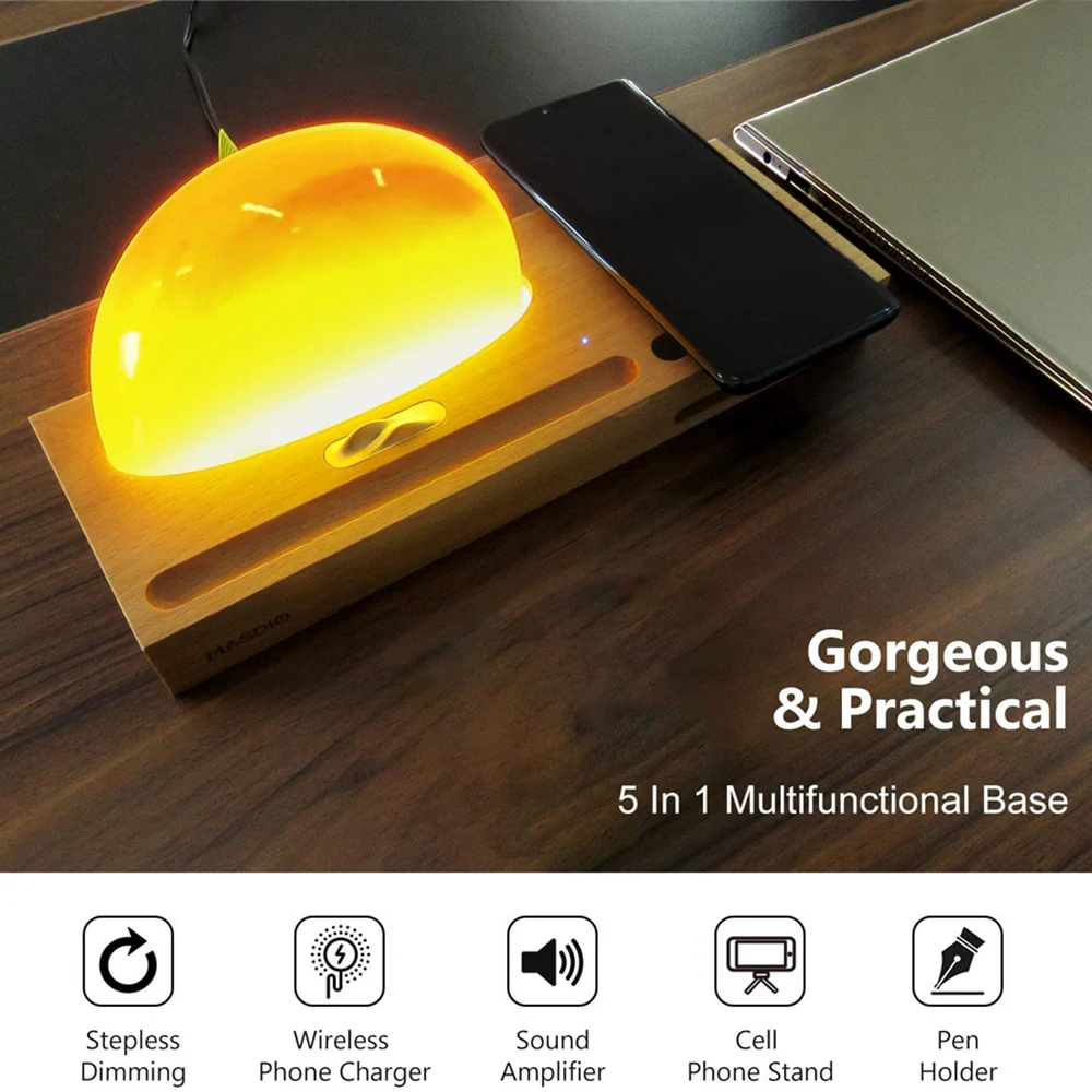 Многофункциональная база 5 в 1-база Sunrise из Европейского бука отличается бесступенчатым регулятором яркости, беспроводным зарядным устройством для телефона, подставкой для сотового телефона, звуковым усилителем и держателем для ручек.