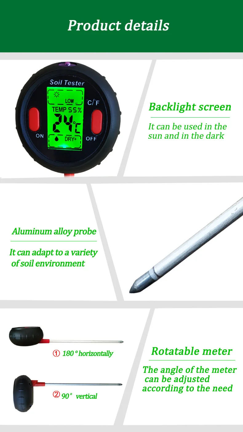 Этот инструмент представляет собой многофункциональный электронный цифровой анализатор почвы, является профессиональным оборудованием для измерения качества почвы. Он в основном тестирует экологическое увлажнение почвы, влажность окружающей среды, содержание влажности почвы, температуру почвы и ph почвы. Прибор использует батарею one- 6F229V с напоминанием о низком энергопотреблении. С подсветкой ЖК-дисплея, простые и четкие. 18-сантиметровый Зонд из алюминиевого сплава адаптируется к испытанию окружающей среды почвы toshi. Продукт небольшой по конструкции, подходит для эргономики, прост в эксплуатации, прост в переноске и повышает эффективность тестирования. Guanghui применяется для цветов, растений и цветов, озеленение сада. Название: инструмент для исследования почвы Размер изделия: 77*77*33 мм/290 мм Рабочая температура: + 5 C ~ + 40 C Источник питания: аккумулятор 9 В (не входит в комплект) Дата производства: см. Крышку Интерфейс дисплея большого экрана Достаточно длинный Зонд из алюминиевого сплава для адаптации к Многопочвенная среда Функция преобразования системы Функция быстрого отключения питания Функция автоматического выключения: Через пять минут, нет автоматического Завершение любой операции Примечание: Перед использованием внимательно прочитайте инструкцию. Основная часть продукта не должна погружаться в грязь или водный раствор при работе; Основная часть продукта не должна погружаться в воду или дождь. Не вставляйте зонд продукта слишком сильно в почву, иначе он повредит инструмент.