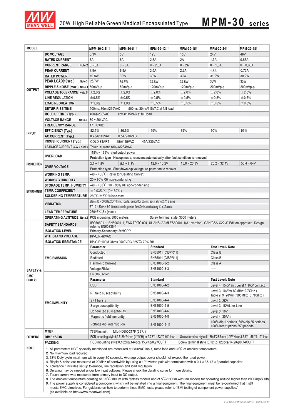 MPM-30-это 30 Вт высокой плотности и небольшого размера (69,5*39*24 мм) AC/DC модуль типа медицинского блока питания, предложенный в контактном типе. Он оснащен 80 ~ 264VAC, низкое энергопотребление без нагрузки менее 0,075 Вт, высокая эффективность до yo 91%, calss II (без FG) двойная изоляция, выдающееся рассеивание и высокий срок службы Благодаря внутренней полировке, 5G антивибрации, высокой производительности EMC, изоляции 4KVAC и т. д. Дизайн соответствует IEC/EN60601-1 и ANS/AAMI ES60601-1 версии 3 с уровнем 2 * MOPP и сверхнизким током утечки (<80uA). Это очень подходит для BF (пациента контакта) типа медицинского устройства или соответствующего оборудования. В дополнение к стилю монтажа печатной платы, серия MPM-30 также предлагает винтовую модель типа клеммы (ST)