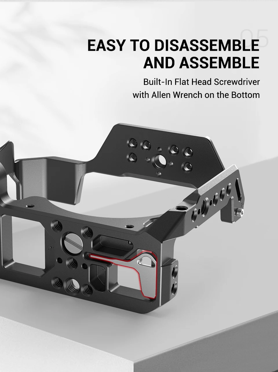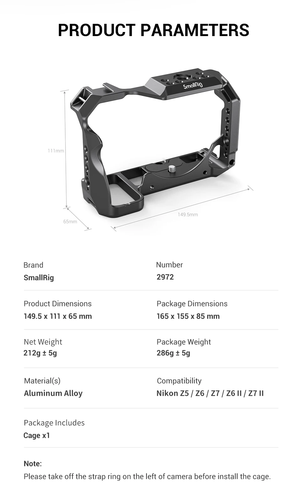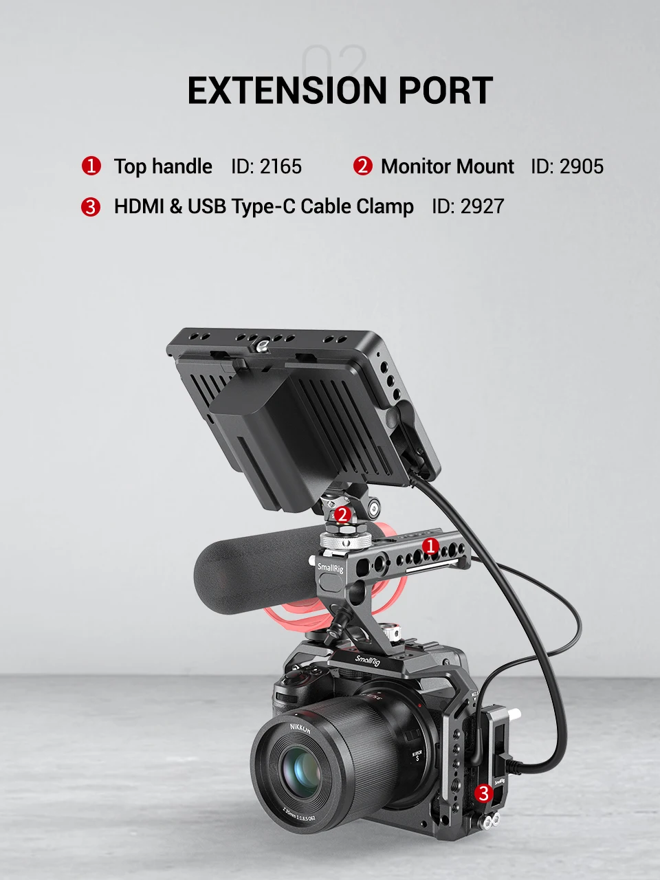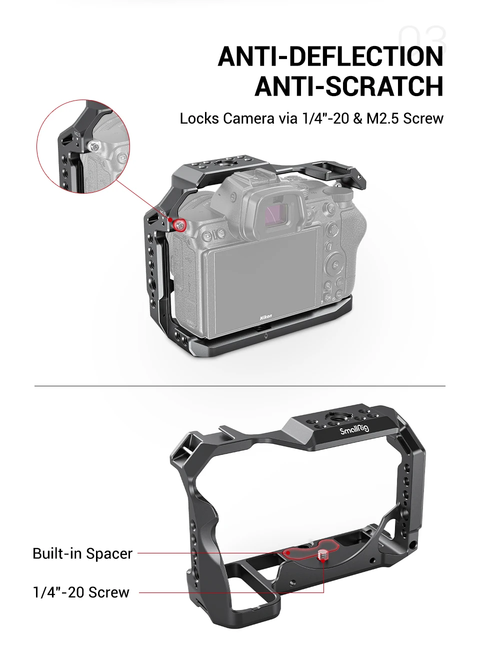 Мелкая клеткаДля Nikon Z5/Z6/Z7Камера 2972-это опалубка с полной клеткой, предназначенная для обеспечения защиты и крепления аксессуаров. Клетка крепится к камере с помощью винта 1/4 ”-20 на дне и винта m2.5 на левой стороне для дальнейшей безопасности, чтобы предотвратить скручивание. С несколькими резьбой 1/4 ”-20 и ARRI 3/8”-16 для аксессуаров, таких как2165 с верхней ручкой и креплением для монитора 2903. Клетка интегрируется с холодной обувью сверху для микрофона и светильник, и поставляется с Рельсом NATO на левой стороне для2187 с ручкой NATO. Клетка также совместима сFTZ адаптер объектива поддержка 2244Который доступен отдельно. В комплект входит отвертка с плоской головкой и шестигранным ключом для крепления винта камеры и хранения в нижней части клетки. Кроме того, клетка с каждой стороны обеспечивает ремешок для переноски. СпециальныйКабель HDMI и USB зажим 2927Продается отдельно для защиты портов HDMI и USB.