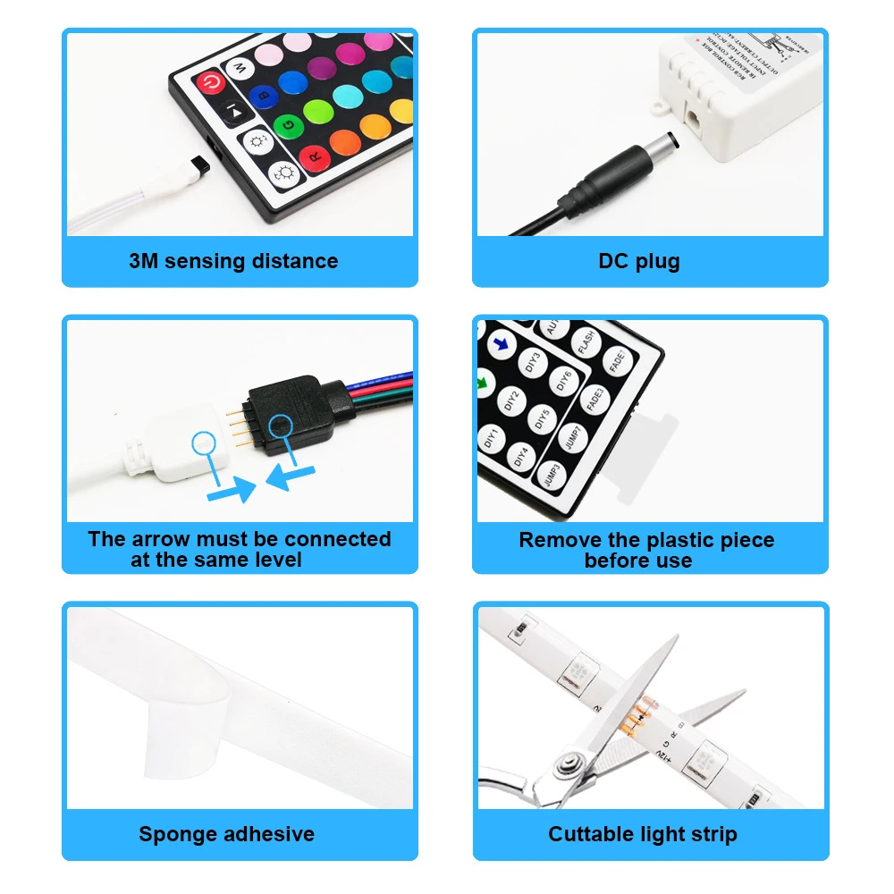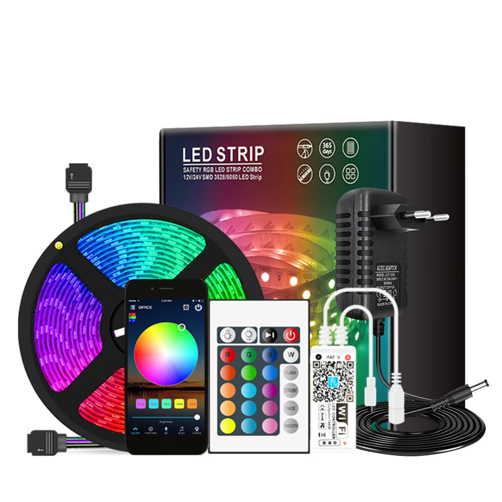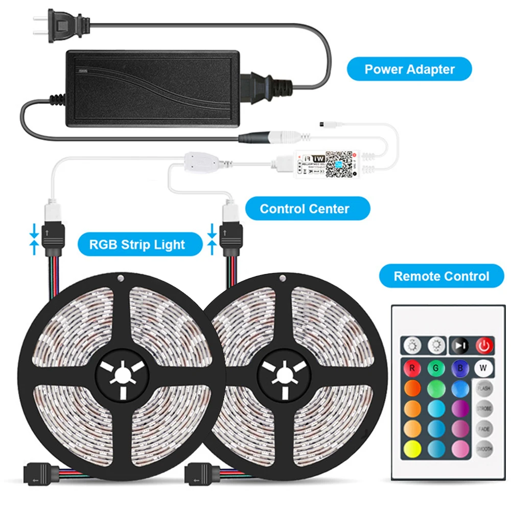 Комплектация: В комплект входит Светодиодная лента 5 м 150 шт. или светодиодная лента 10 м 300 шт., ИК-пульт дистанционного управления, светодиодный контроллер wifi, адаптер питания и руководство пользователя на английском языке.