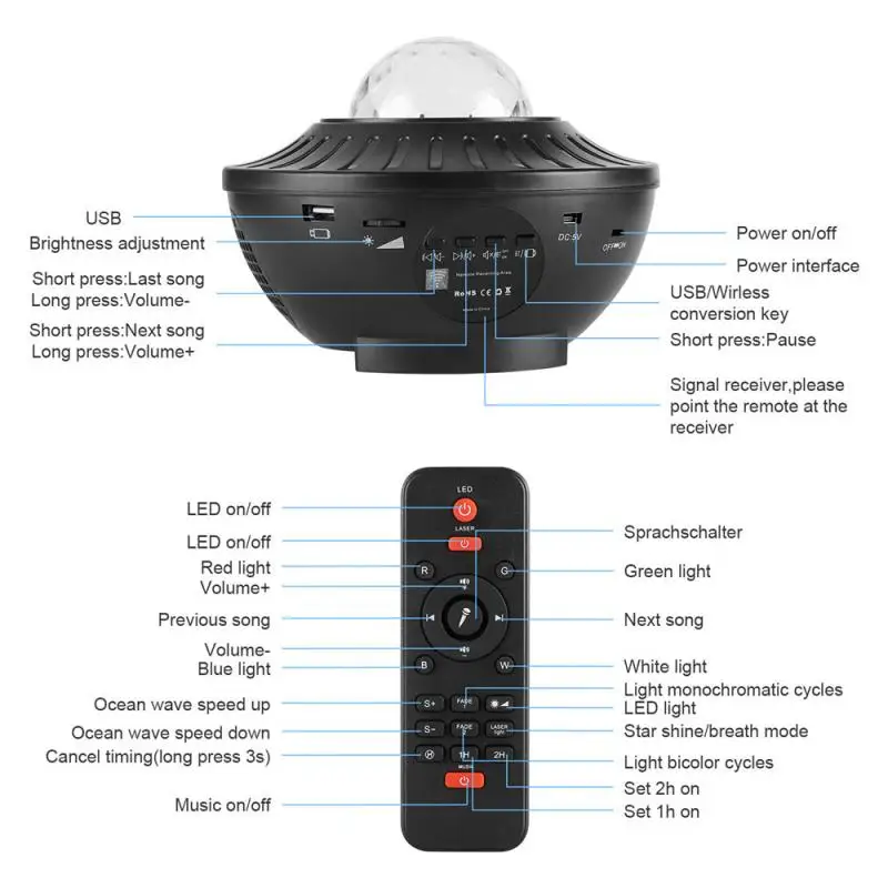 Пульт дистанционного управления может регулировать цвет водяных знаков, скорость водяных знаков, режим водяных знаков, режим Bluetooth, одно управление водяных знаков, одно лазерное управление, яркость, управление музыкой, управление звуком, режим выбора, Функция синхронизации, переключатель.
