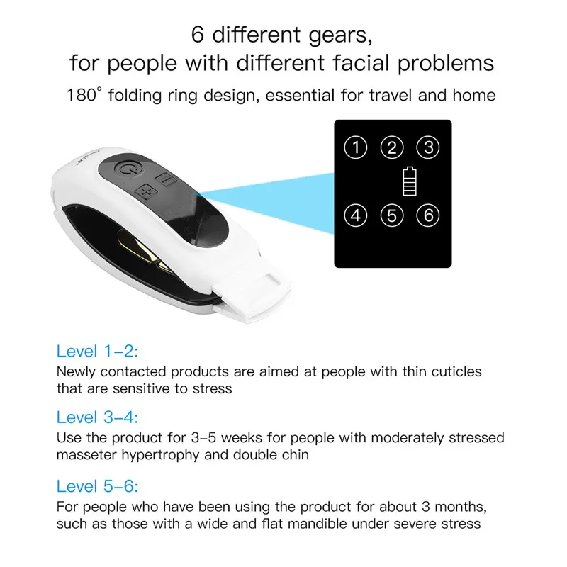 MR152 Особенности: 1. Технология бионической стимуляции микротока стимулирует мышцы через биологические токи в человеческом теле и близкие микротоки, подтягивает кожу и формирует идеальные лицевые линии 2. Складное кольцо 180 °, необходимое для путешествий и домашнего интерьера 3. TENS внешний импульсный дизайн, может массировать руки, бедра, икры, живот, талию, ягодицы и другие части, Модернизированная версия 4 массажных головок, автоматический режим массажа (наиболее заметная Точка продаж) 4. Интеллектуальный дисплей, 6 различных передач, для людей с различными проблемами лица 6 передач Уровень 1-2: новые контактные продукты ориентированы на людей с тонкой кутикулой, чувствительных к стрессу Уровень 3-4: используйте продукт в течение 3-5 недель для людей с умеренно напряженной гипертрофией массажиста и двойным подбородком Уровни 5-6: для людей, которые используют продукт около 3 месяцев, например, с широкой и плоской нижней челюстью при тяжелом стрессе Спецификация: Материал: АБС-пластик Напряжение: DC5V Мощность: 5 Вт Емкость аккумулятора: 800 мА Время зарядки: 2-3 часа Время использования: около 1 часа Передача: 6 Длина usb-кабеля для зарядки: 48 см ± 2 см Длина соединительного кабеля: 118 см ± 2 см Дисплей зарядки: красный свет мигает при зарядке, свет выключен, когда он полный Посылка включает в себя 1 х машина 1 х Регулируемый пояс 2 x органических полимеров электродный башмак 1 x USB кабель 1 x десятки кабеля 1 х Руководство пользователя