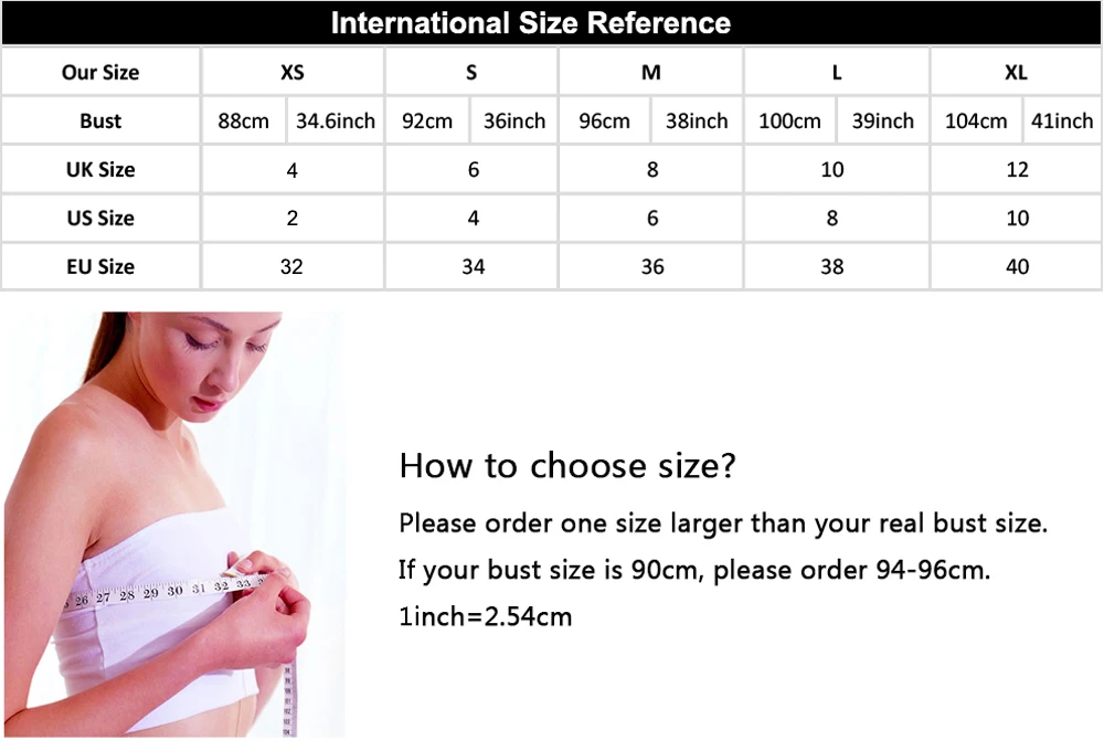 Пожалуйста, выбирайте размер в соответствии с нашей таблицей размеров, обычно выбирайте на 4-6 см больше, чем ваш реальный размер груди. Если размер груди 90 см, пожалуйста, выберите размер M.