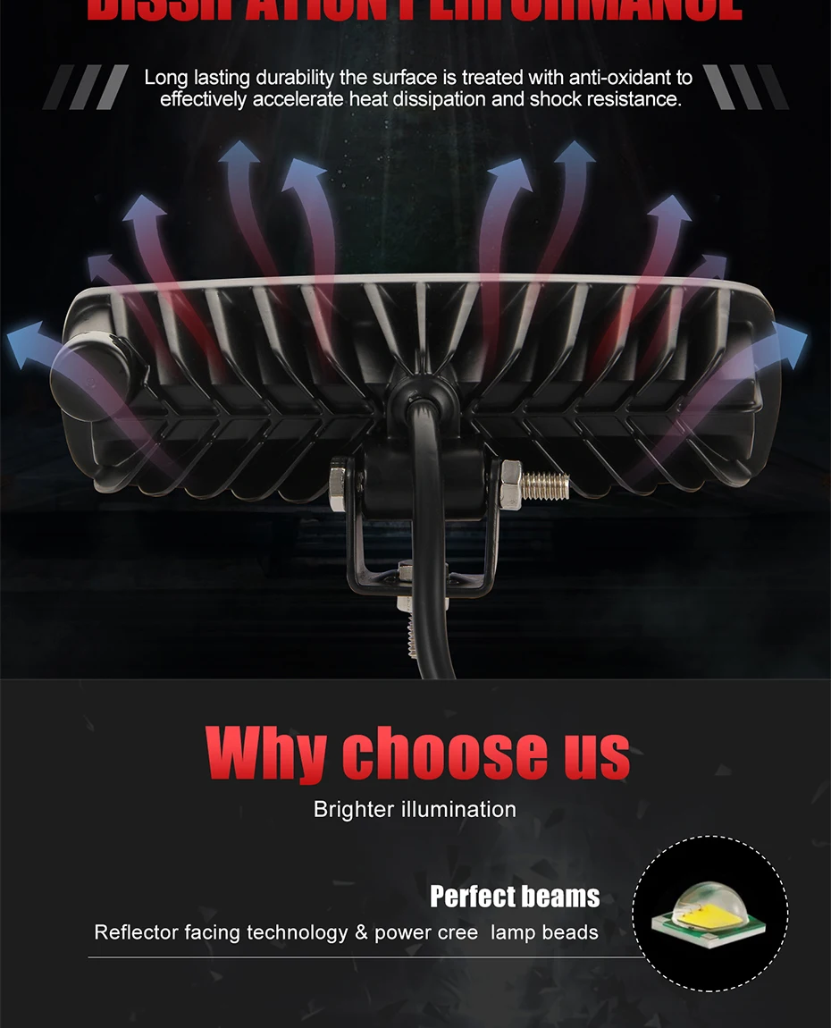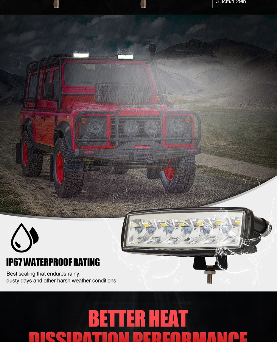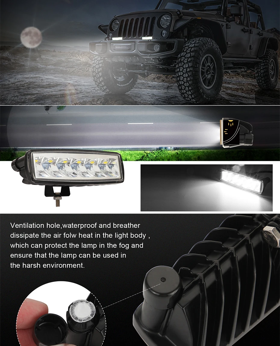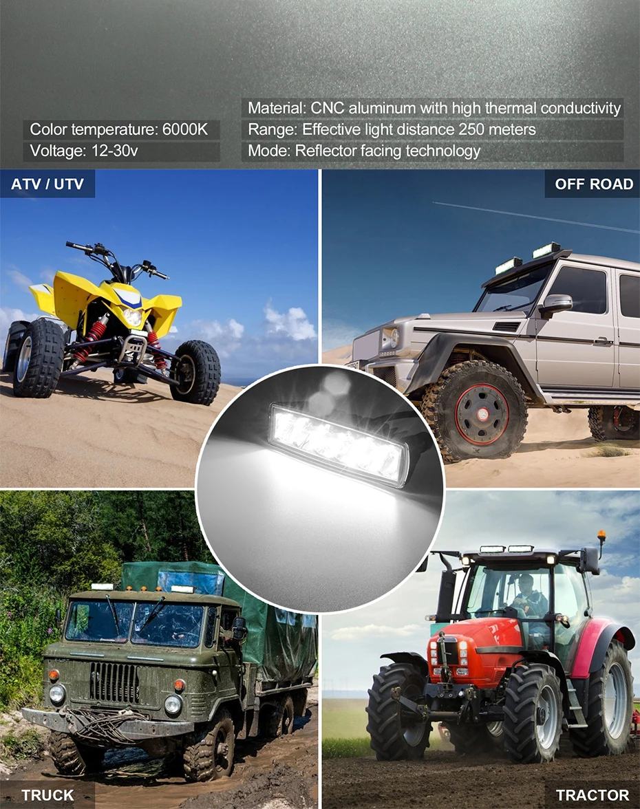 Рабочее напряжение: 10-30 В постоянного тока (подходит для автомобиля 12 В/24 В) Рабочая температура:-40-80 градусов Цельсия Водонепроницаемость: IP 67 Цветовая температура: чистый белый 6000K Материал: Алюминий Срок службы: 50000 часов Монтажный кронштейн: нержавеющая сталь Сертификация: CE,ROHSПрименение:
